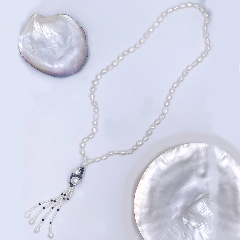 • Ένα εντυπωσιακό κολιέ με λευκά μαργαριτάρια Fresh Water Pearl διαμέτρου 8 x 10 χιλιοστών σχήματος Long.