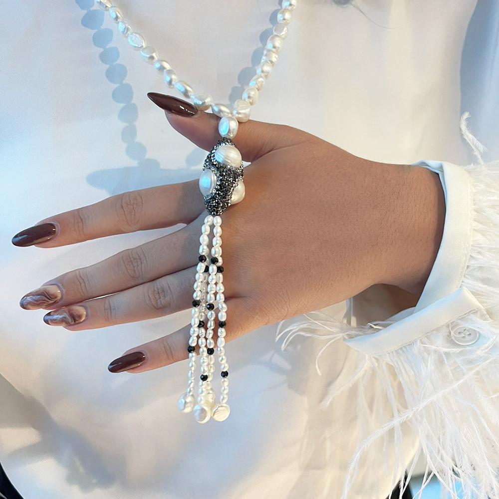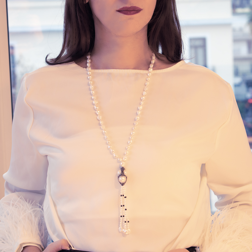 Το κολιέ ξεχωρίζει για το ιδιαίτερο σχέδιο του καθώς στο κέντρο του υπάρχει ένα λαμπερό μενταγιόν διακοσμημένο όλο με μαύρα και λευκά ζιργκόν και 4 μαργαριτάρια ακατέργαστα σε σχήμα Baroque διαμέτρου 10 χιλιοστών.