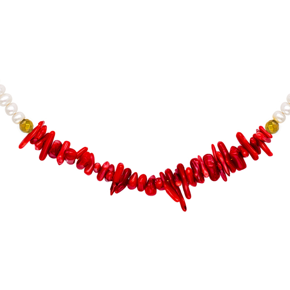 Ανάμεσα στα κοράλλια και στα λευκά μαργαριτάρια υπάρχουν 2 hematite χρυσού χρωματισμού πολυεδρικής κοπής, προσθέτοντας στο κολιέ περισσότερη λάμψη.