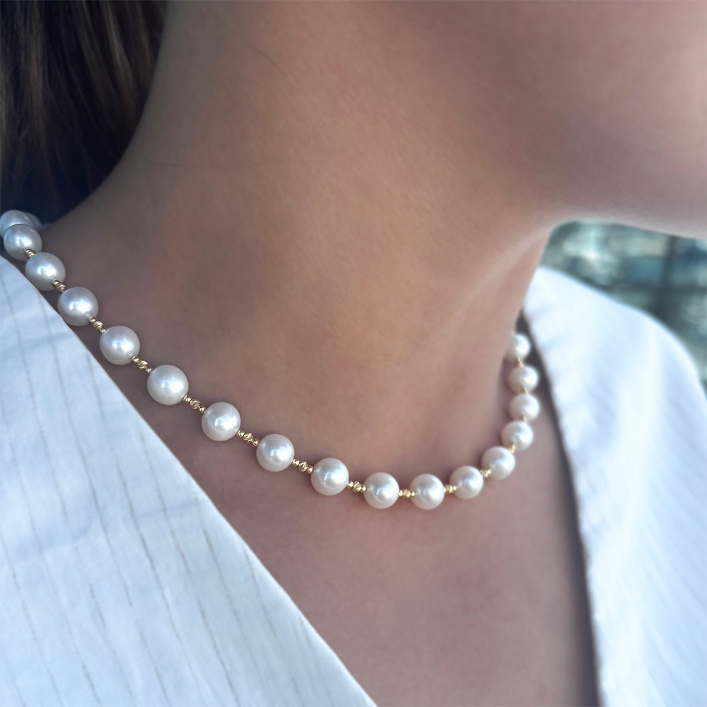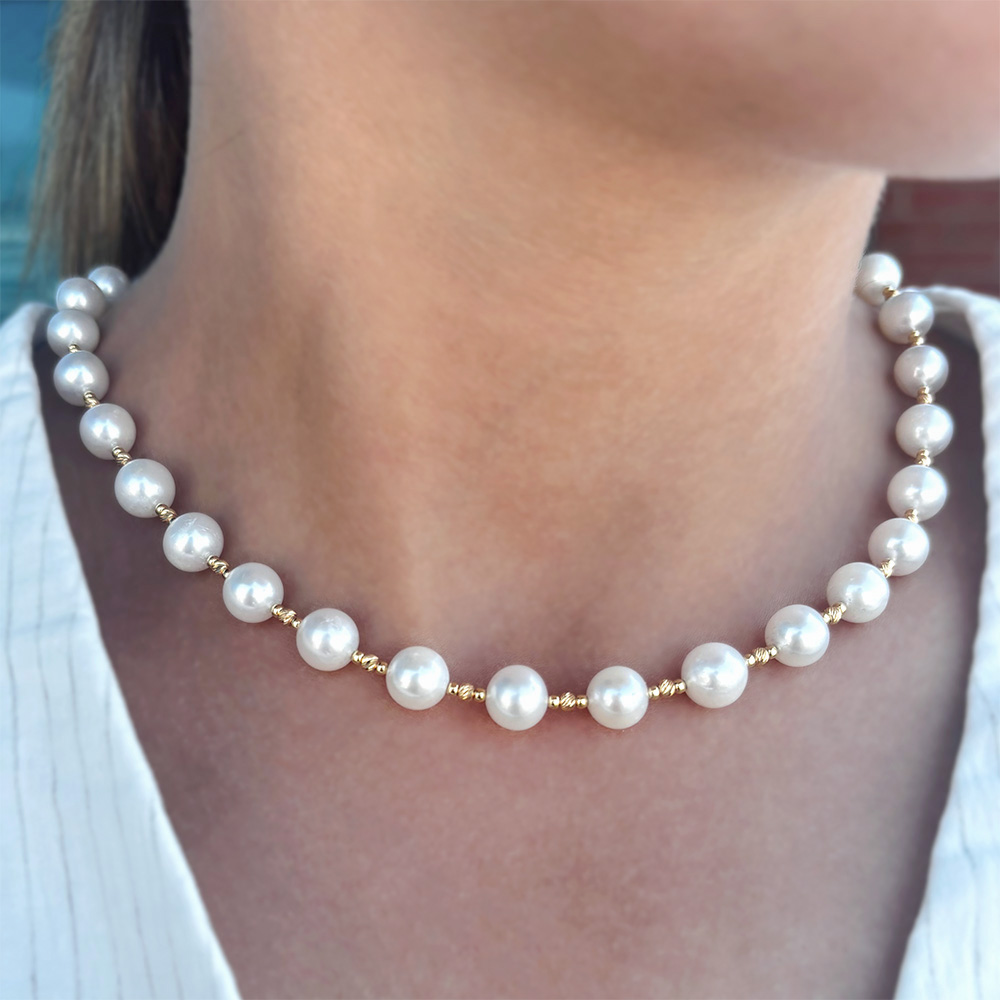 • Ένα υπέροχο κολιέ με λευκά στρόγγυλα μαργαριτάρια Fresh Water Pearl διαμέτρου 9-10 χιλιοστών με πολύ ωραίο γυάλισμα.
