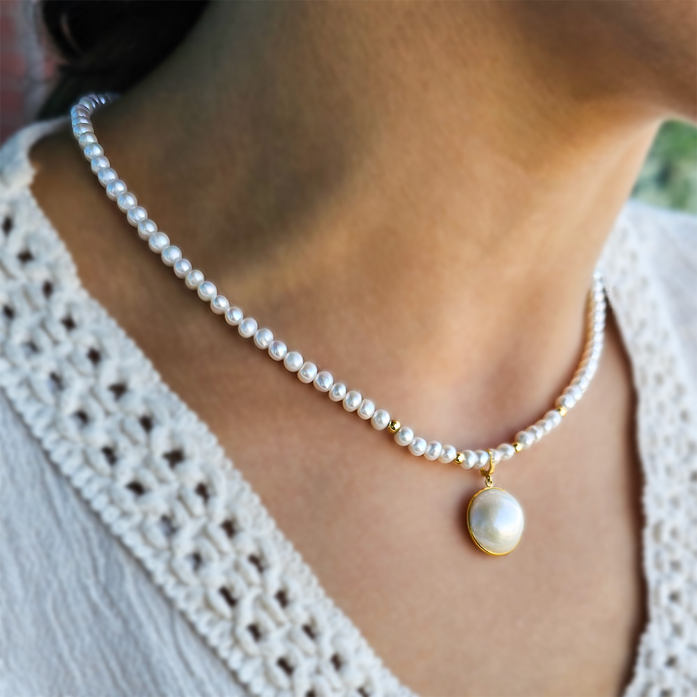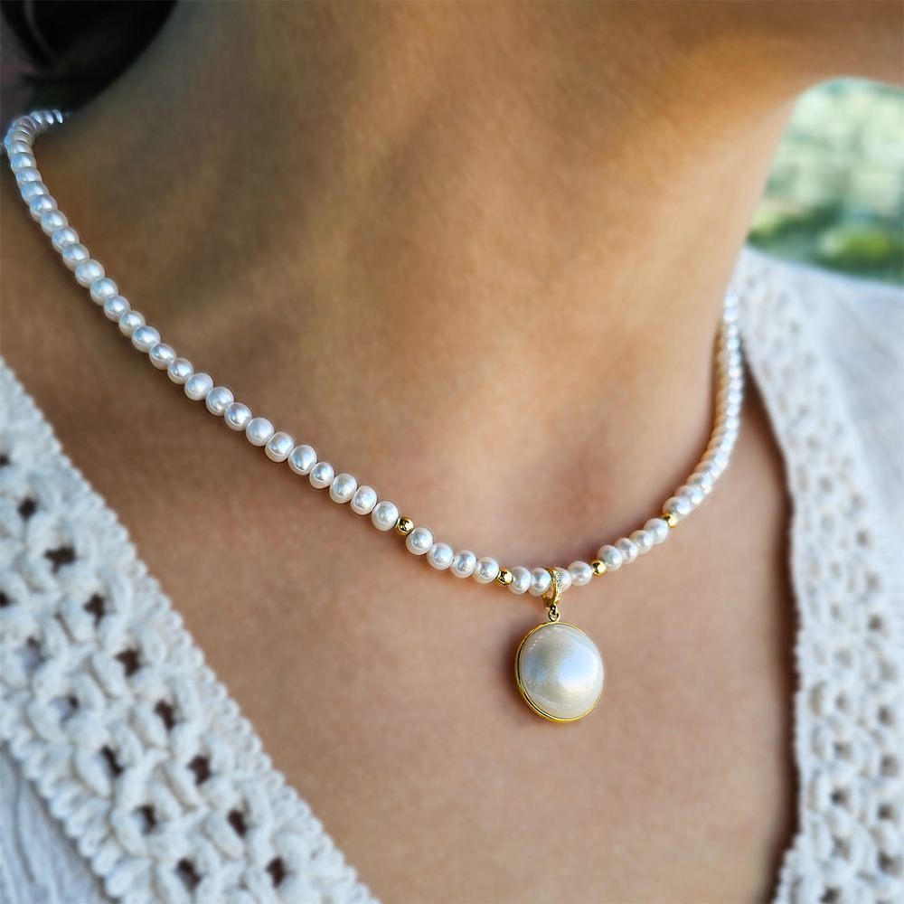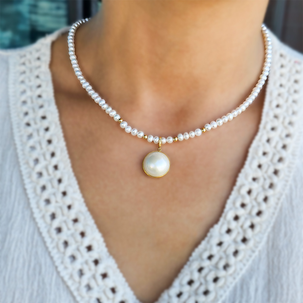 Κολιέ με Κ18 χρυσό κούμπωμα, λευκά μαργαριτάρια και Κ18 χρυσό μενταγιόν με μαργαριτάρι Mabe - F125427