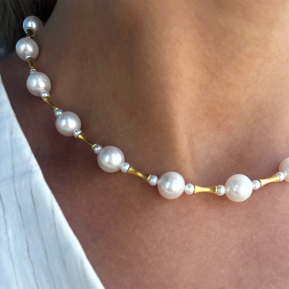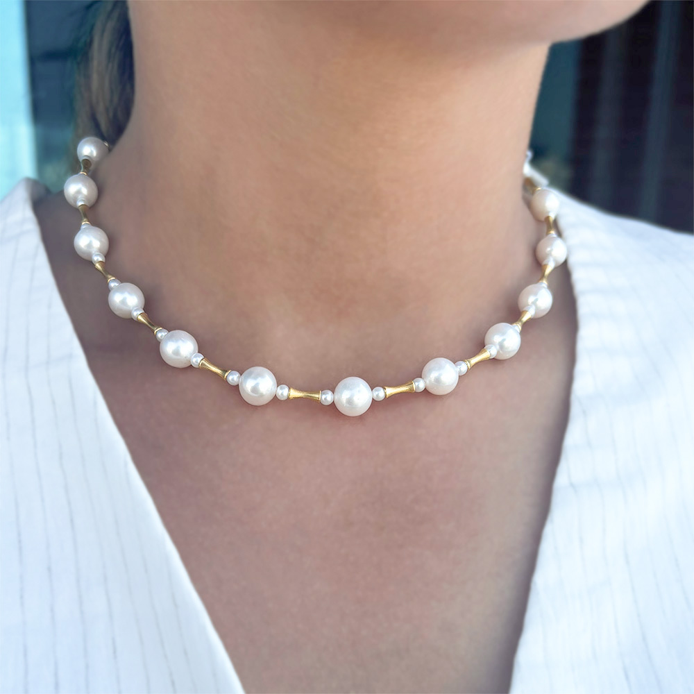 Ένα ιδιαίτερο μαργαριταρένιο κολιέ που συνδυάζει την κλασική ομορφιά των μαργαριταριών με τη λάμψη του χρυσού.
