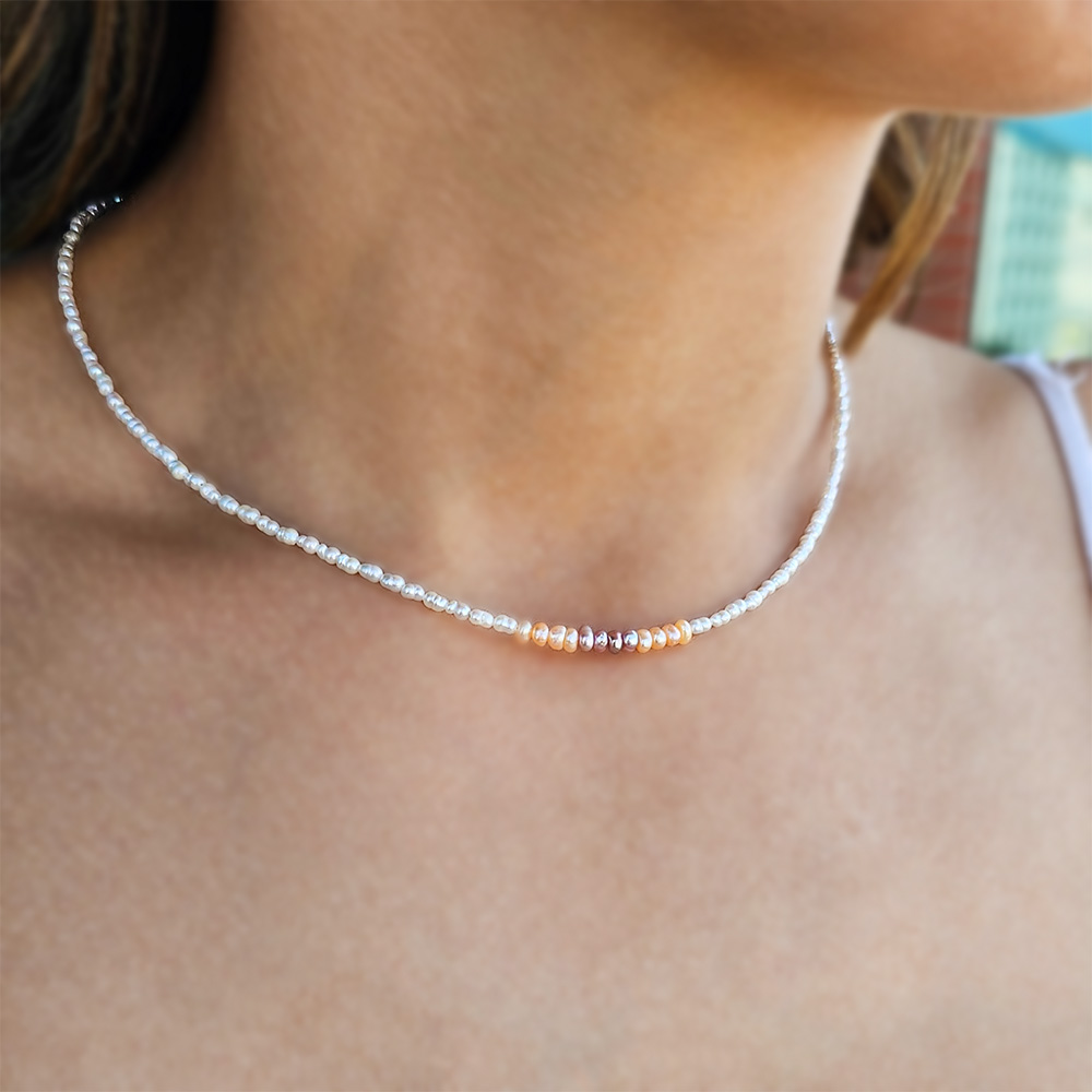 • Ένα υπέροχο κολιέ με λευκά μαργαριτάρια Fresh Water Pearl διαμέτρου 2x3 χιλιοστών.