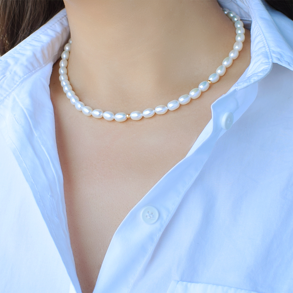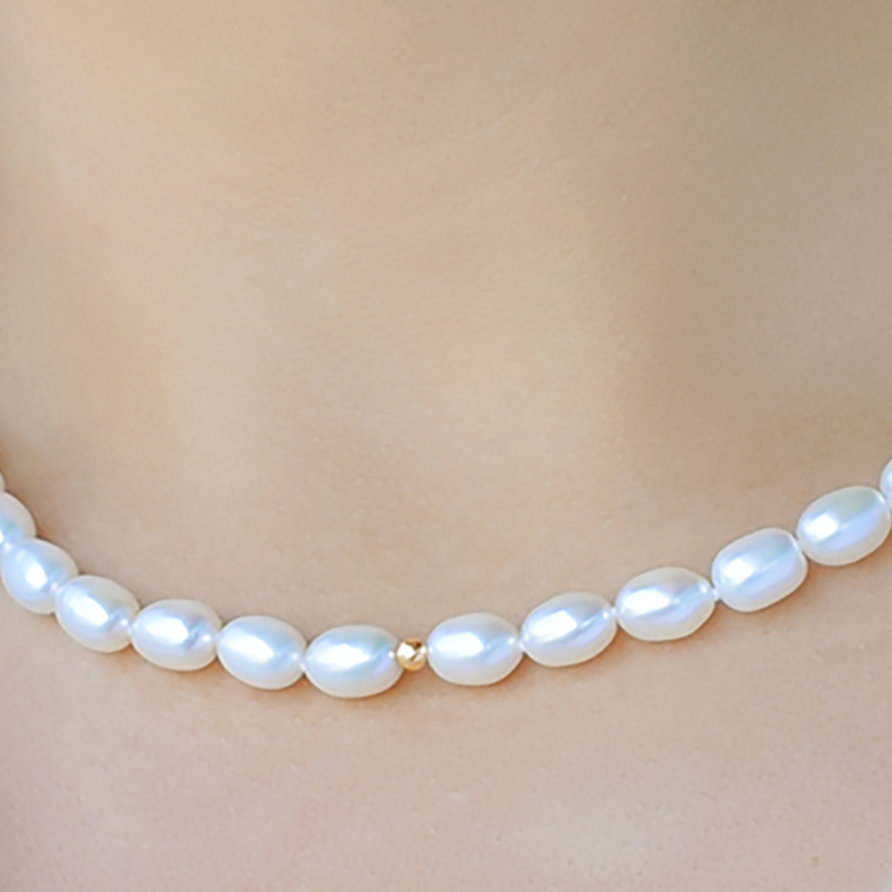 • Ένα υπέροχο κολιέ από λευκά μαργαριτάρια γλυκού νερού Fresh Water Pearl διαμέτρου 6,5 X 8,5 χιλιοστών.