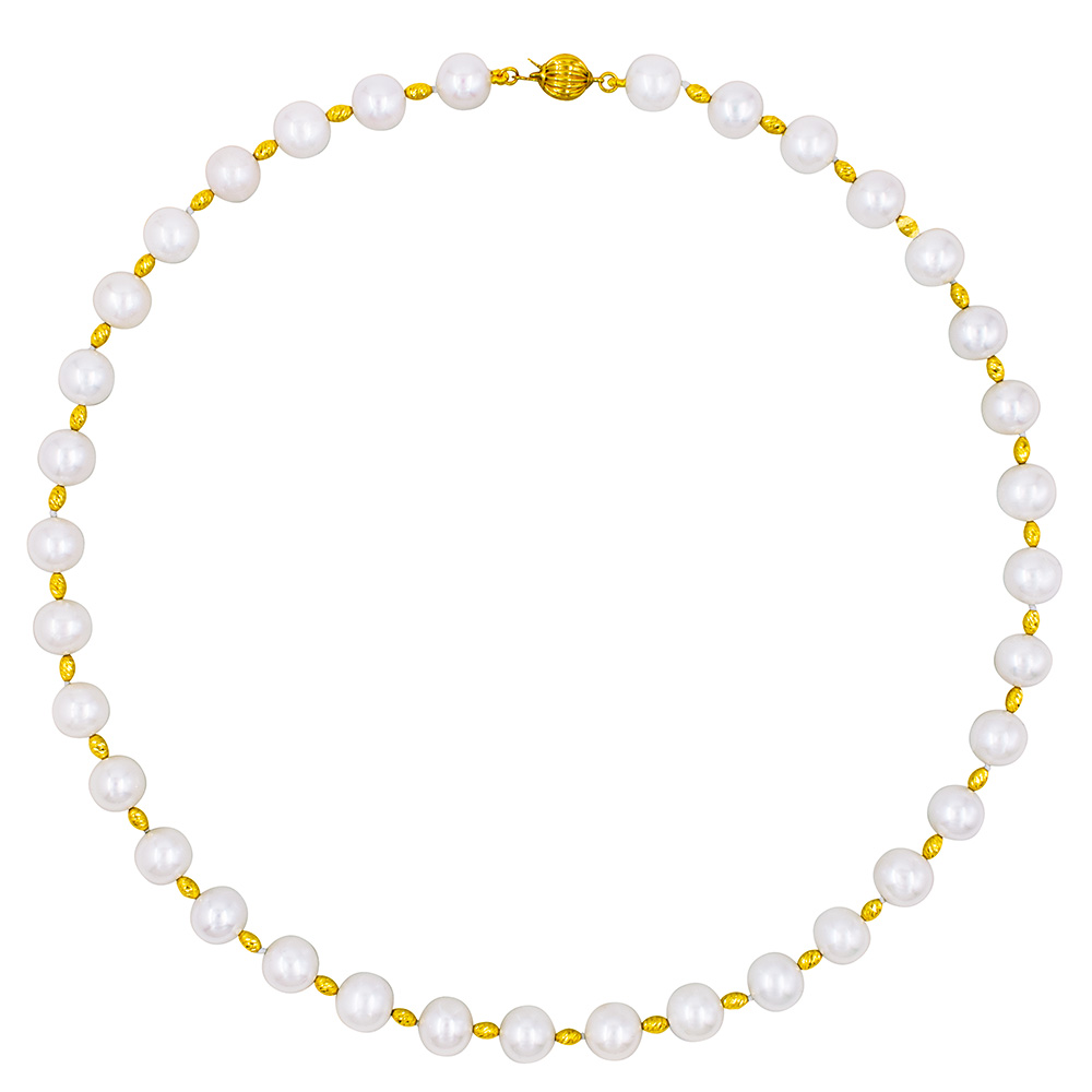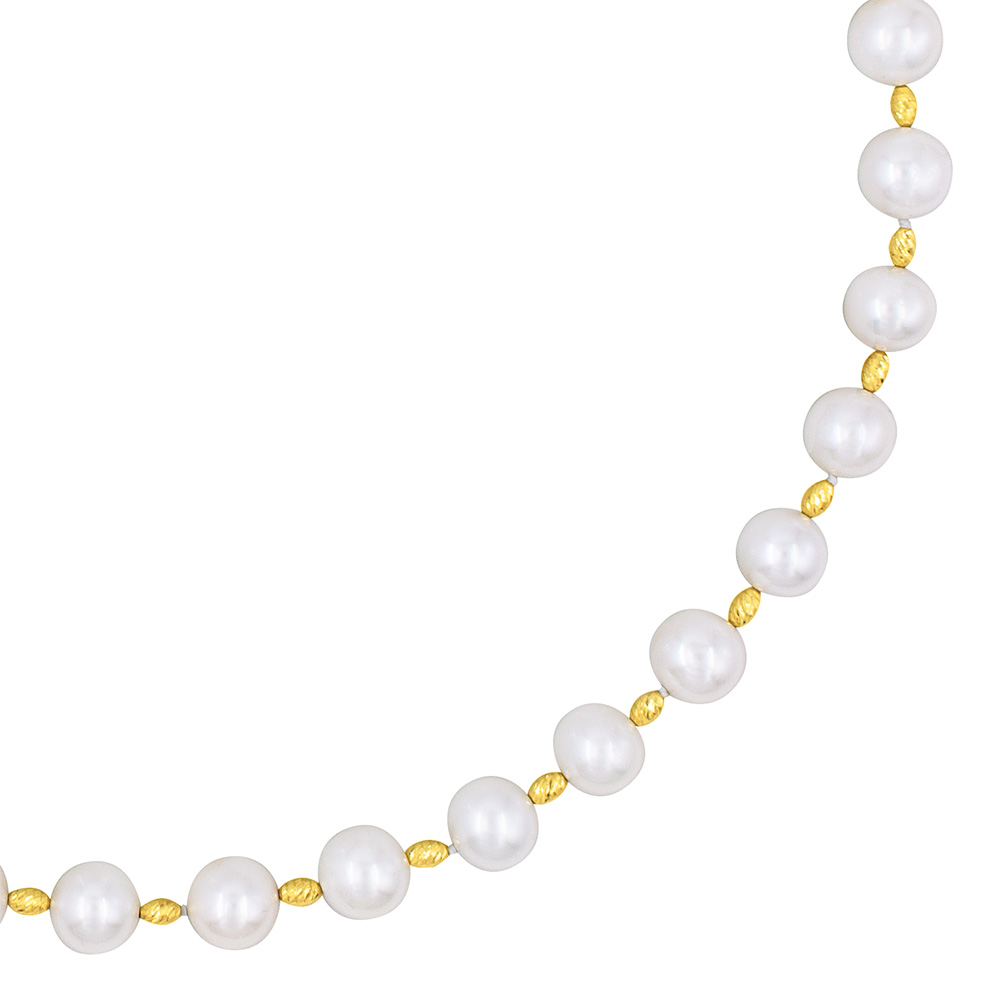 A necklace with a modern aesthetic that harmoniously combines the classic beauty of white pearls with the unsurpassed shine of gold.
