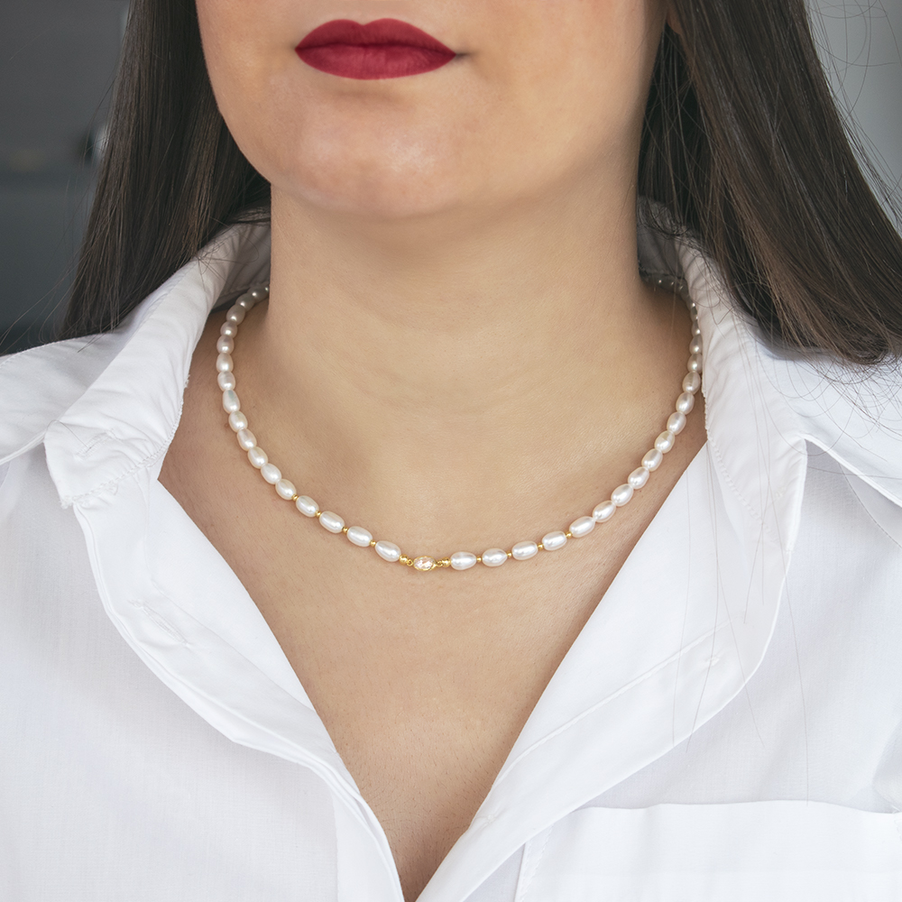 • Ένα υπέροχο κολιέ με λευκά μαργαριτάρια γλυκού νερού Fresh Water Pearl διαμέτρου 6x8 χιλιοστών, σε σχήμα Long.