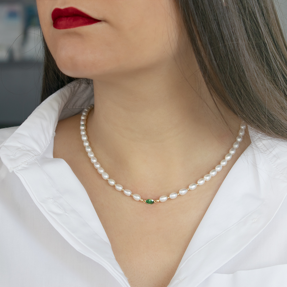 • Ένα υπέροχο κολιέ με λευκά μαργαριτάρια γλυκού νερού Fresh Water Pearl διαμέτρου 6x8 χιλιοστών, σε σχήμα Long.