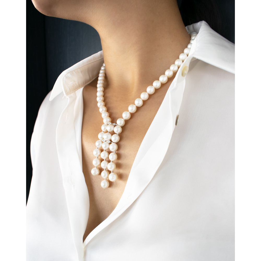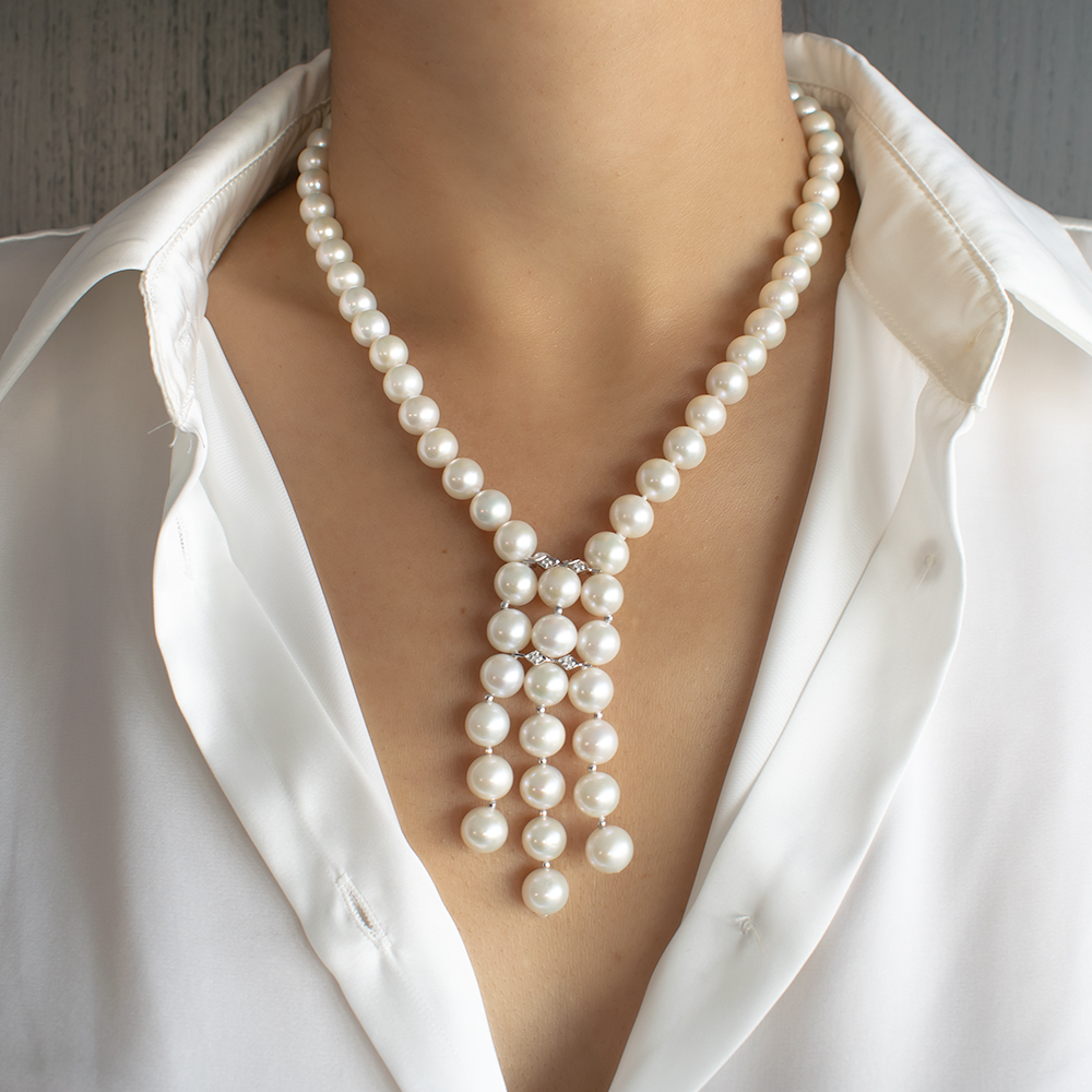 • Ένα εντυπωσιακό κολιέ από τη συλλογή μας Royal Jewelry με λευκά μαργαριτάρια Fresh Water Pearl διαμέτρου 9 χιλιοστών σε σχήμα Round, άριστης ποιότητας.