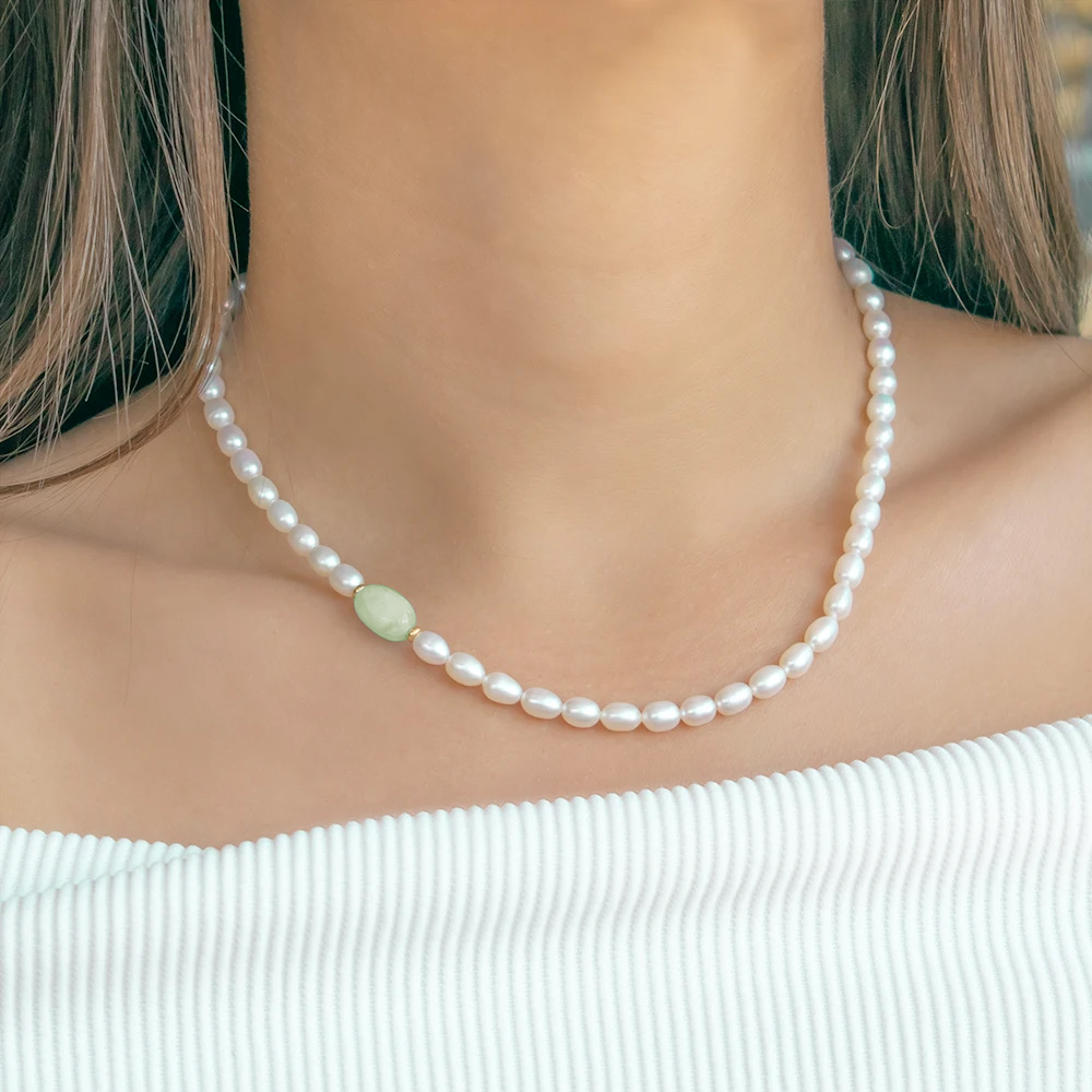 • Ένα υπέροχο κολιέ με λευκά μαργαριτάρια Fresh Water Pearl διαμέτρου 6x7 χιλιοστών σχήματος Long και κούμπωμα χρυσό 14 καρατίων.