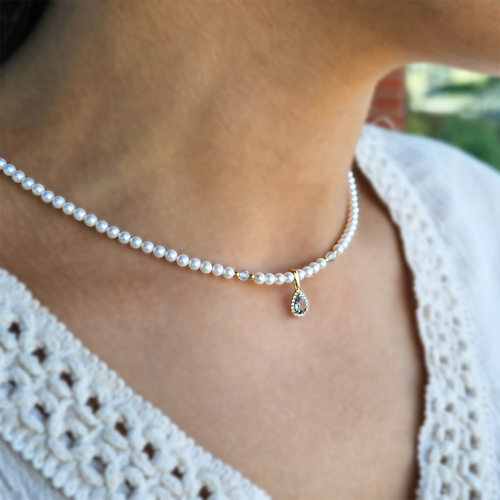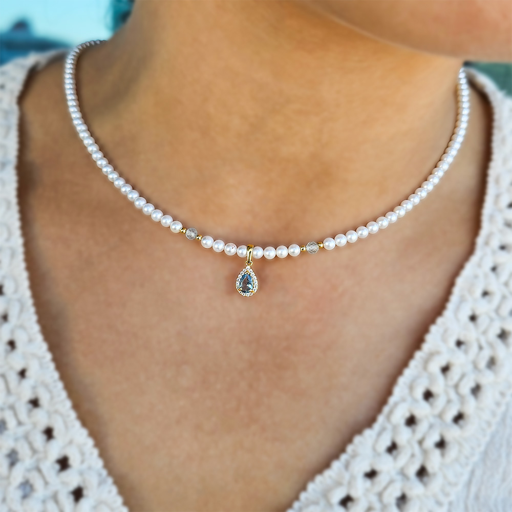Ένα ιδιαίτερο κολιέ που συνδυάζει την κλασική ομορφιά των μαργαριταριών με το ζεστό χρώμα της aqua και τη λάμψη του χρυσού.