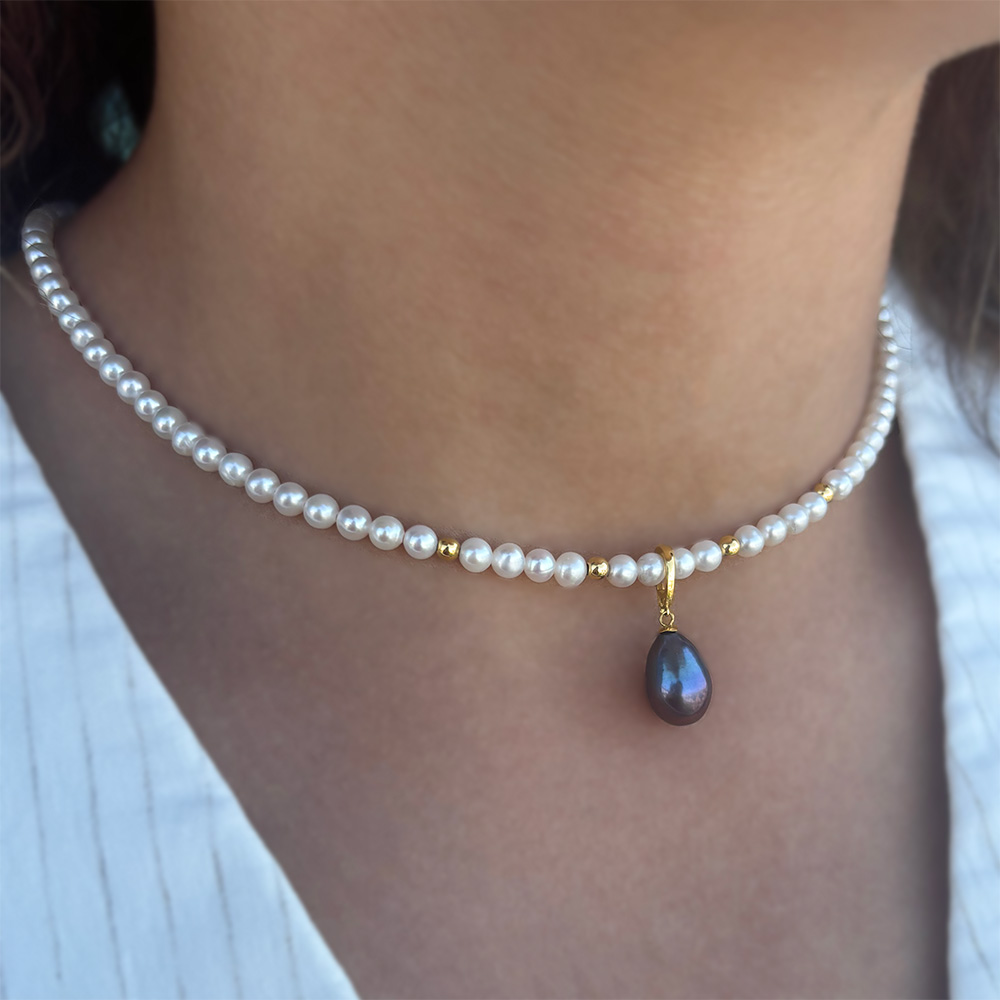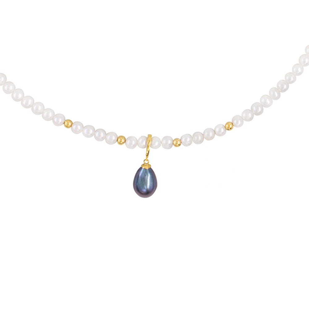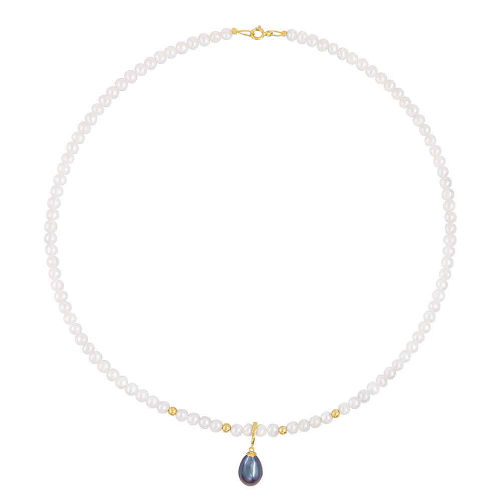 Κολιέ με Κ18 χρυσό κούμπωμα, λευκά μαργαριτάρια και μενταγιόν Κ18 με μαύρο μαργαριτάρι - F125390B