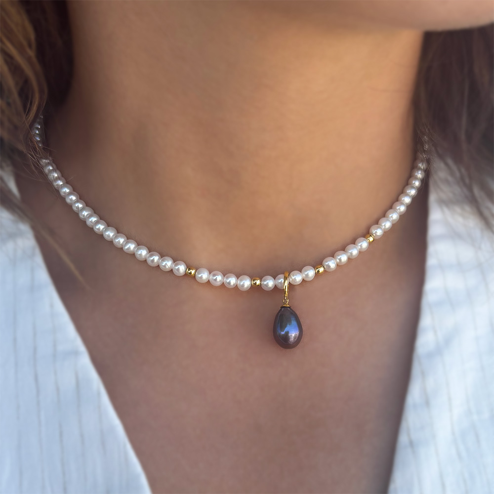 Στο κέντρο του κολιέ υπάρχει ένα χρυσό μενταγιόν 18 καρατίων με ένα μαύρο μαργαριτάρι Long διαμέτρου 8x11 το οποίο έχει κλείστρο και ανοίγει και κλείνει και έτσι μπορείτε να το φορέσετε σε οποιαδήποτε αλυσίδα σας.
