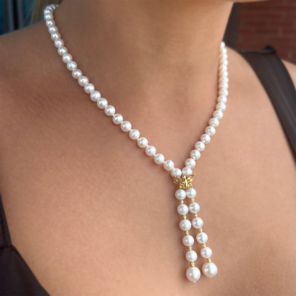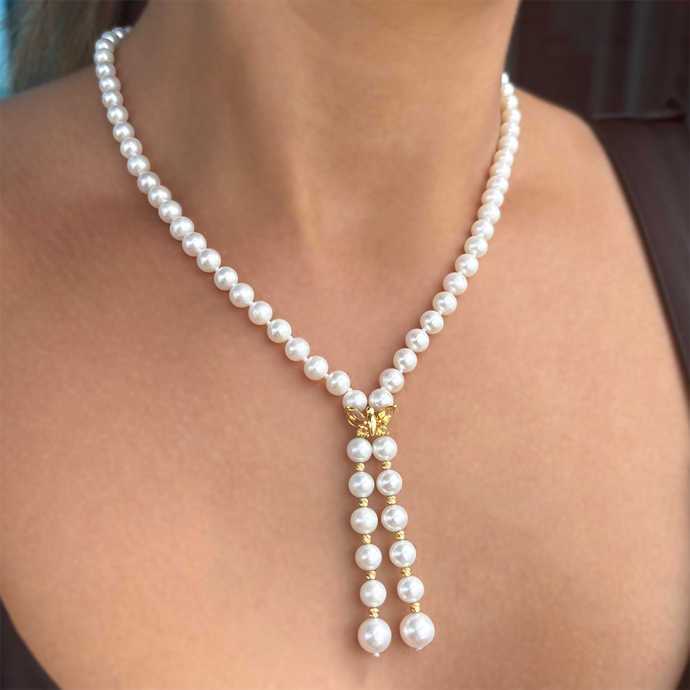 • Ένα υπέροχο κολιέ με λευκά στρόγγυλα μαργαριτάρια Fresh Water Pearl διαμέτρου 6-6,5 χιλιοστών και καταλήγει σε 2 στρόγγυλα μαργαριτάρια 8 χιλιοστών.