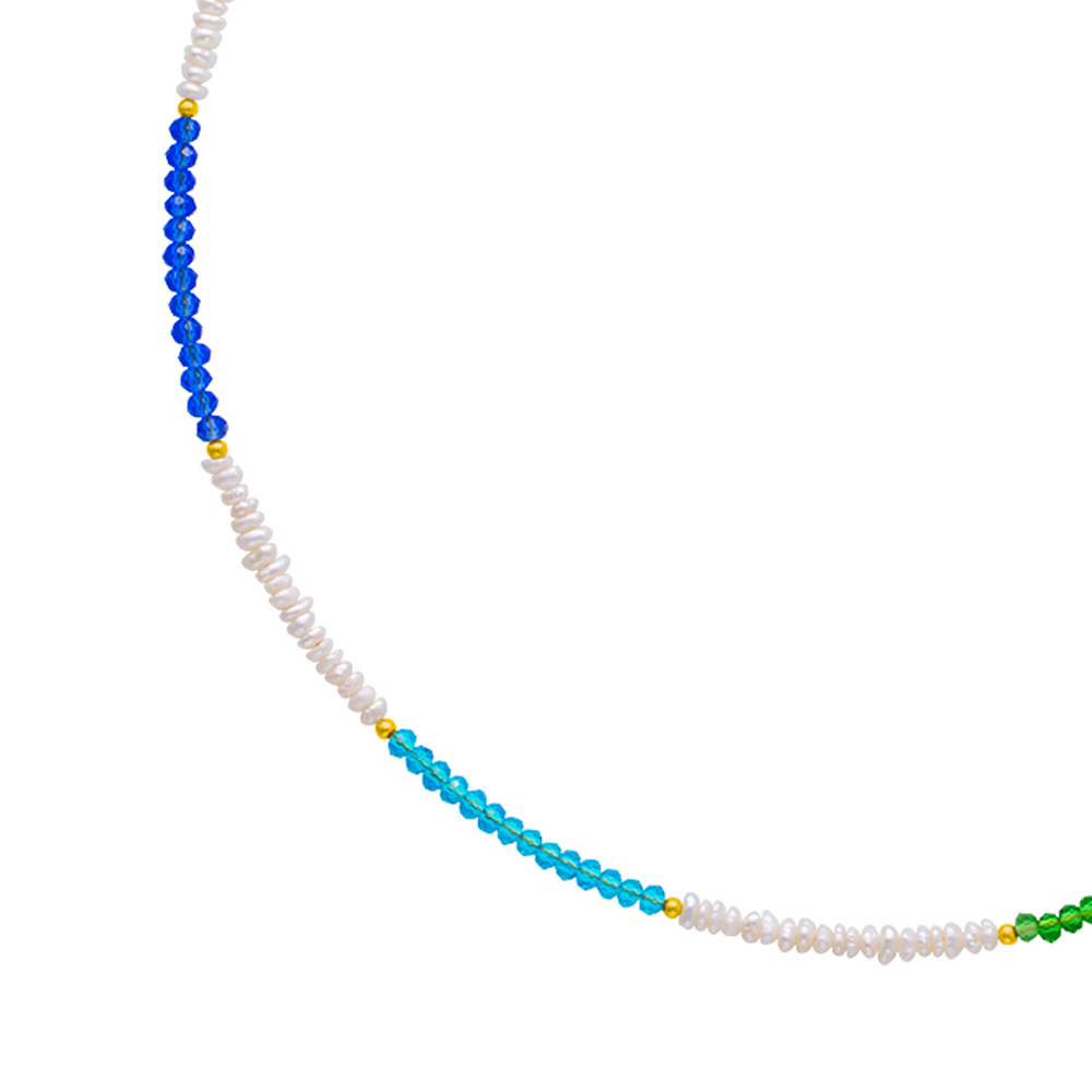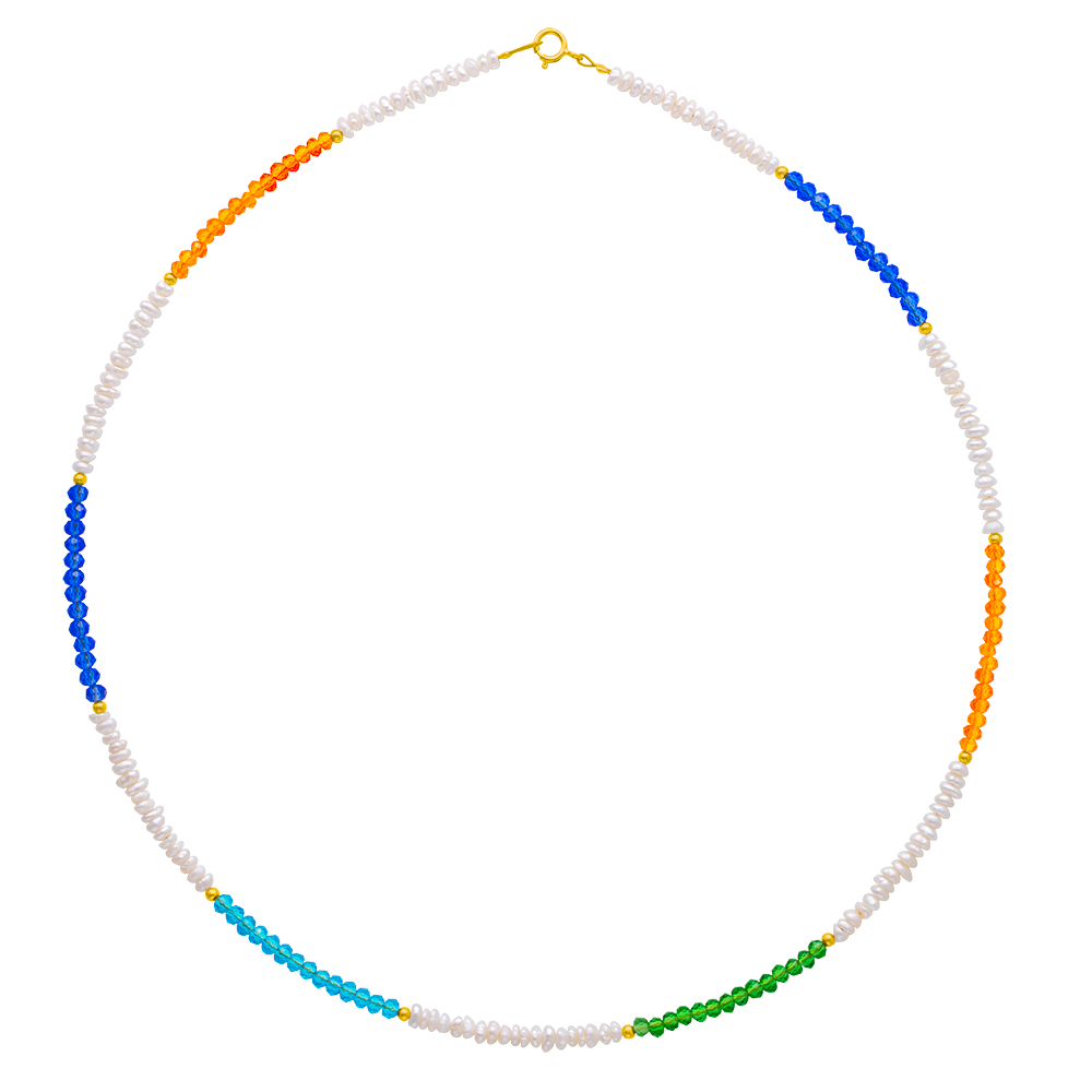 Κολιέ με Κ14 χρυσά στοιχεία, λευκά μαργαριτάρια και multi color crystals - F124406