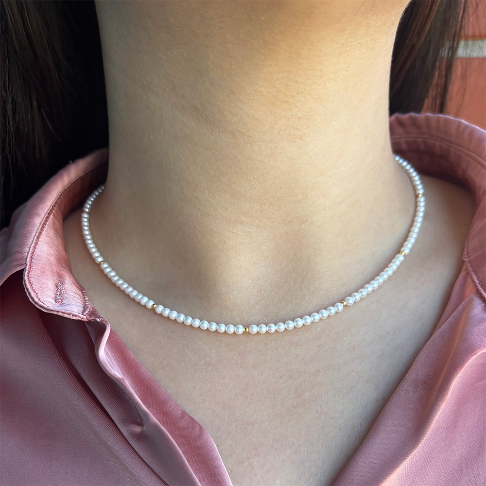 • Ένα υπέροχο κολιέ με ολοστρόγγυλα λευκά μαργαριτάρια Fresh Water Pearl διαμέτρου 3-3,5 χιλιοστών, εξαιρετικής ποιότητας και σχήματος.