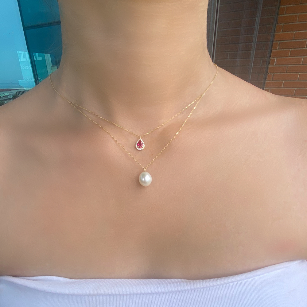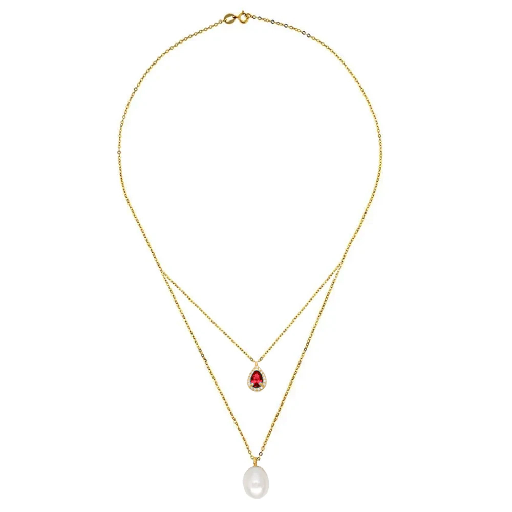 • Ένα υπέροχο κολιέ με χρυσή αλυσίδα Κ14 και δύο μενταγιόν. Το ένα μενταγιόν είναι με λευκό μαργαριτάρι Fresh Water Pearl διαστάσεων 9 x 11 χιλιοστών σε σχήμα Long  και το άλλο μενταγιόν ένα εντυπωσιακό κόκκινο ζιργκόν στολισμένο περιμετρικά από λευκά ζιργκόν σε διάσταση 7x10 .