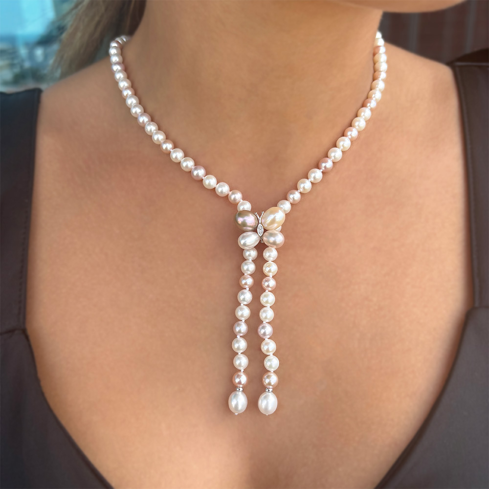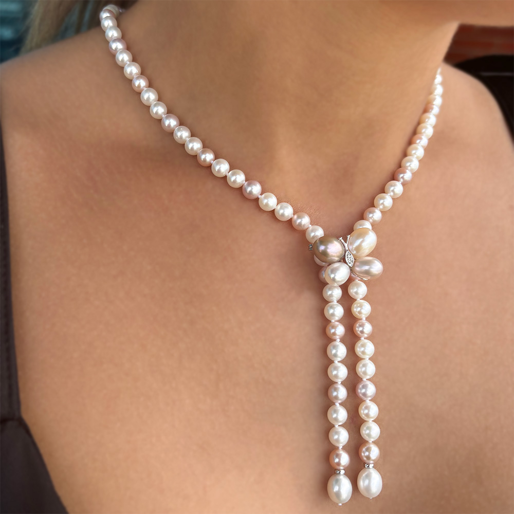 Κολιέ με Κ18 λευκόχρυσα στοιχεία, πολύχρωμα μαργαριτάρια και μενταγιόν / καρφίτσα πεταλούδα - F319503