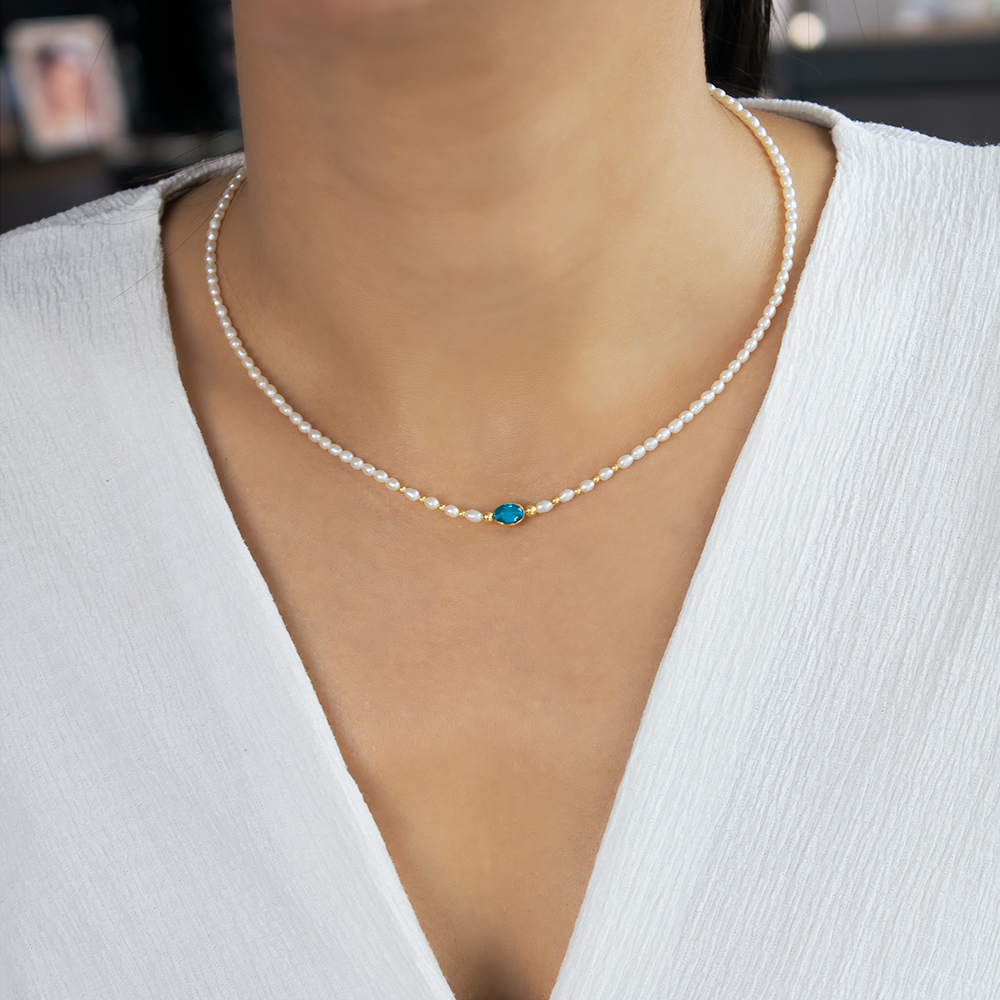 Ενδιάμεσα στα μαργαριτάρια υπάρχουν 10 χρυσές μπιλίτσες 14 καρατιών εκ των οποίων οι 8 είναι διαμέτρου 2 χιλιοστών και οι 2 που αγκαλιάζουν το Blue Topaz Cubic Zircon διαμέτρου 3 χιλιοστών.