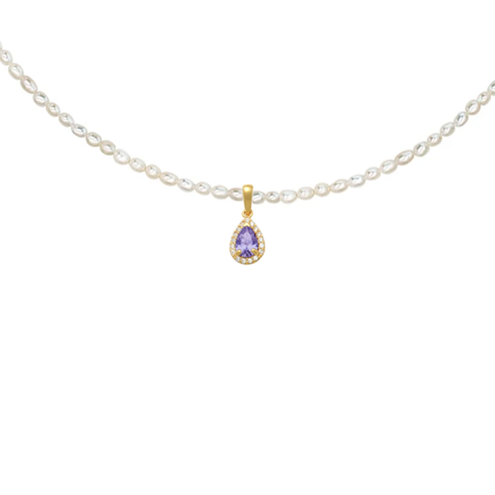 Στο κέντρο του κολιέ υπάρχει ένα εντυπωσιακό μενταγιόν χρυσό 14 καρατίων με φασεταρισμένο ημιπολύτιμο λίθο Amethyst CZ  διαμέτρου 7x10 χιλιοστών σε σχήμα δάκρυ.
