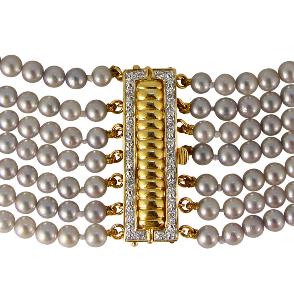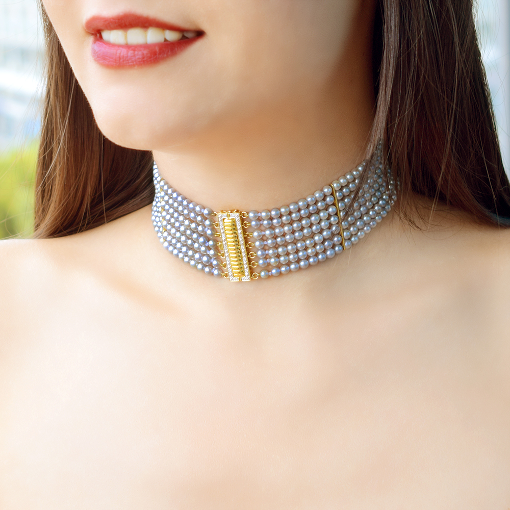 • Ένα καταπληκτικό κολιέ CHOKER από 7 σειρές διαφορετικού μήκους multigrey μαργαριτάρια θαλάσσης QTV Akoya Pearl διαμέτρου 4-4,5 χιλιοστών, άριστης ποιότητας σε σχήμα Round (στρόγγυλο).