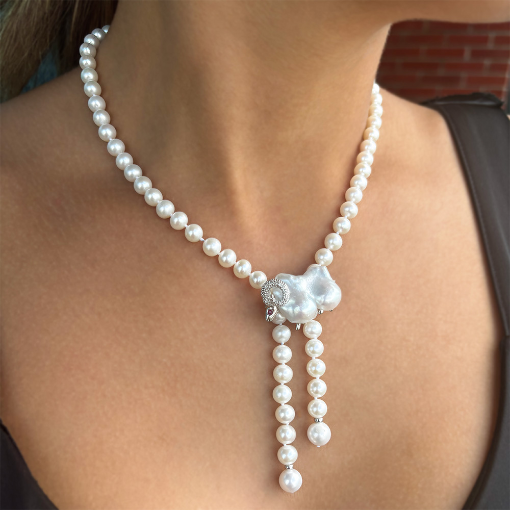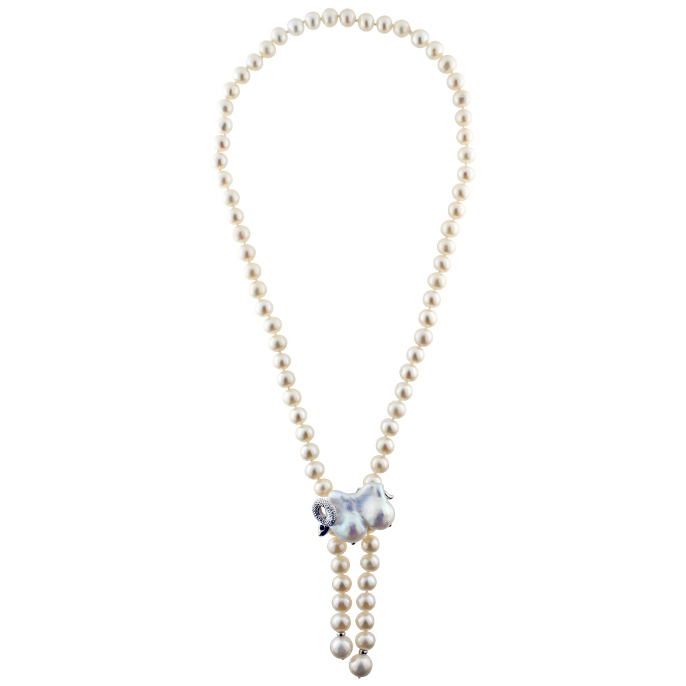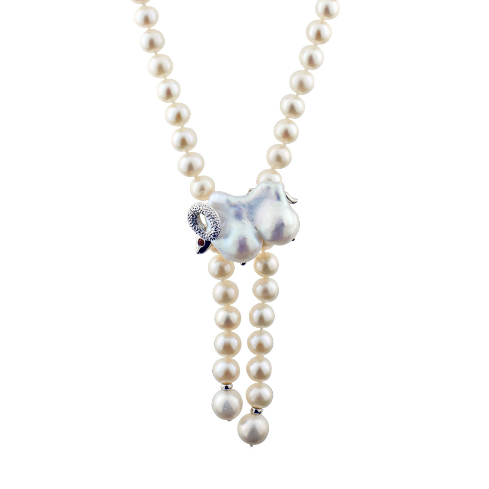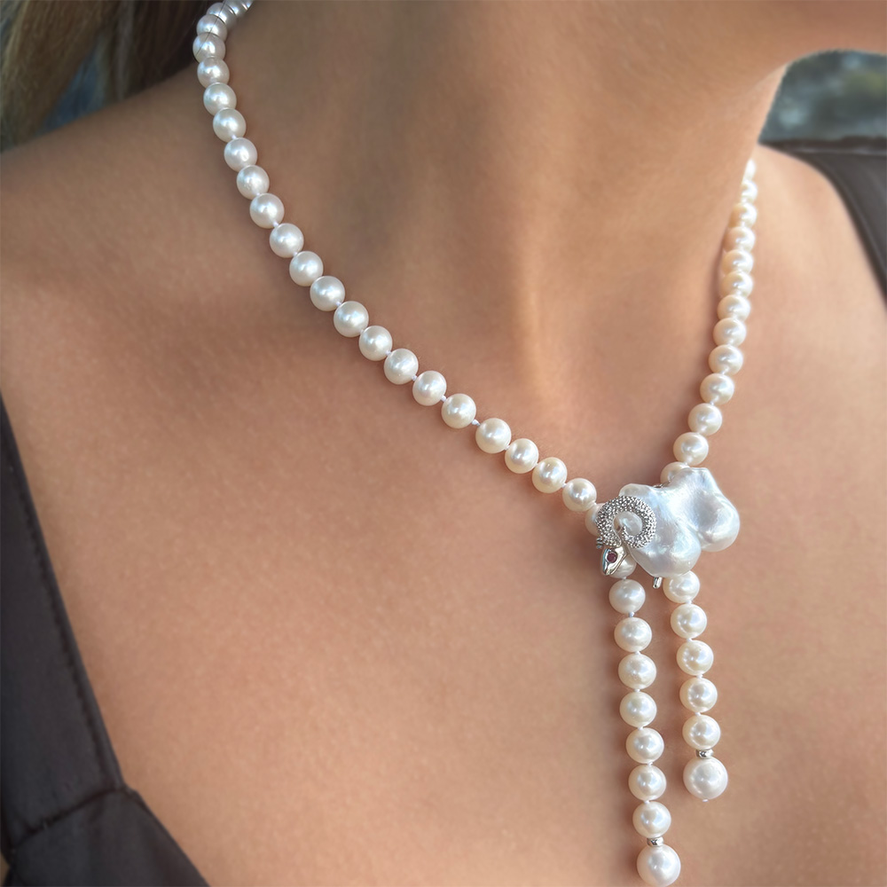 Στο κάτω μέρος του κολιέ υπάρχει μία μοναδική καρφίτσα - μενταγιόν σε σχήμα κριάρι από φυσικό και σπάνιο μαργαριτάρι Biwa Baroque σε λευκόχρυση βάση 18 καρατίων με 4 διαμάντια 0,02ct και 1 ρουμπίνι 0,02ct.