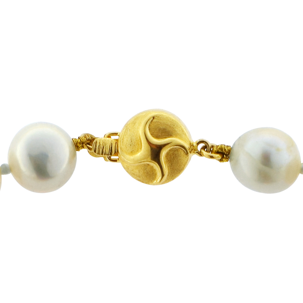 Είναι δεμένο με μεταξωτό νήμα που δημιουργεί κόμπους ενδιάμεσα στα μαργαριτάρια για λόγους προστασίας και ασφάλειας.
