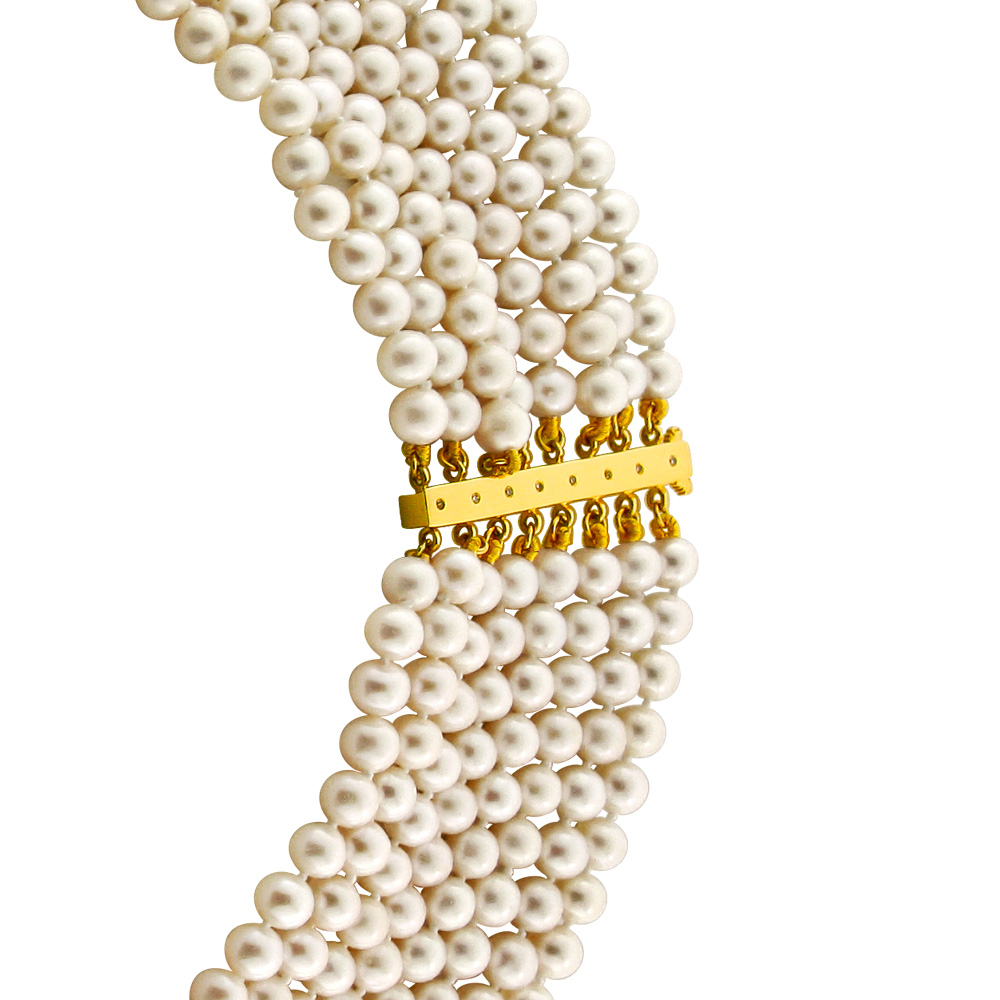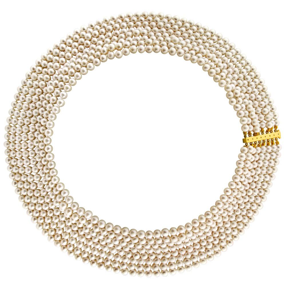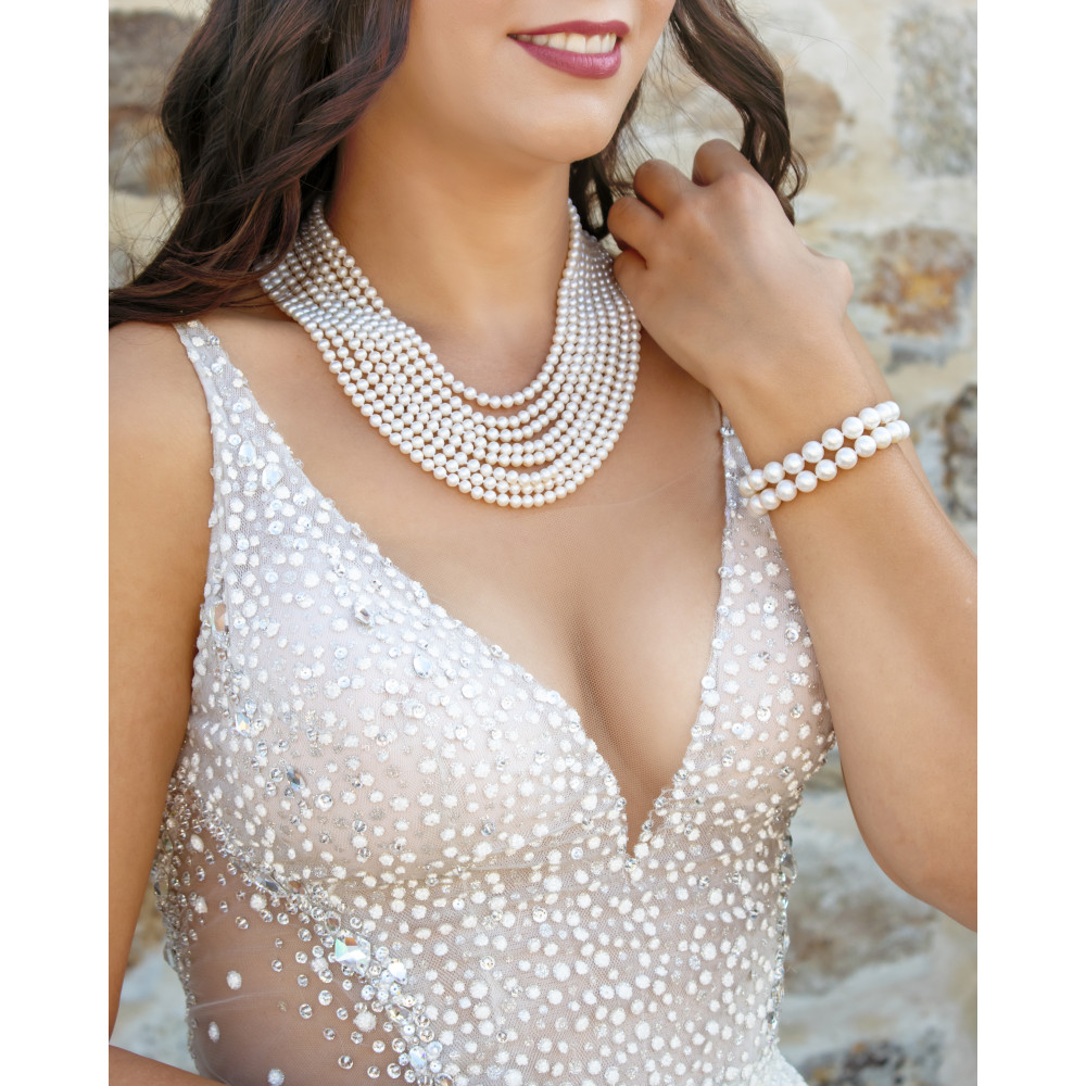 • Ένα μοναδικό κολιέ απο 8 σειρές διαφορετικού μήκους, λευκά μαργαριτάρια γλυκού νερού Fresh Water Pearl διαμέτρου 5-5,5 χιλιοστών, άριστης ποιότητας σε σχήμα στρογγυλό.