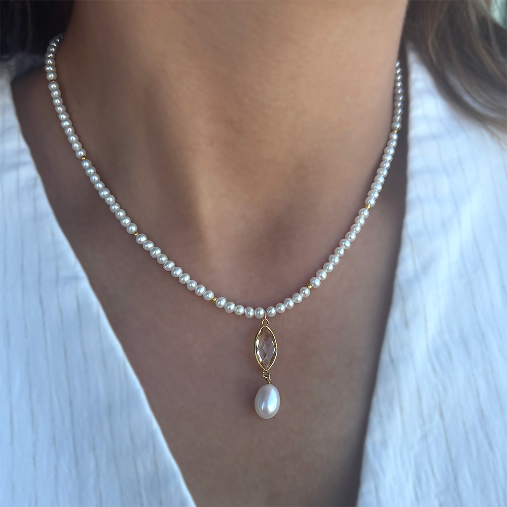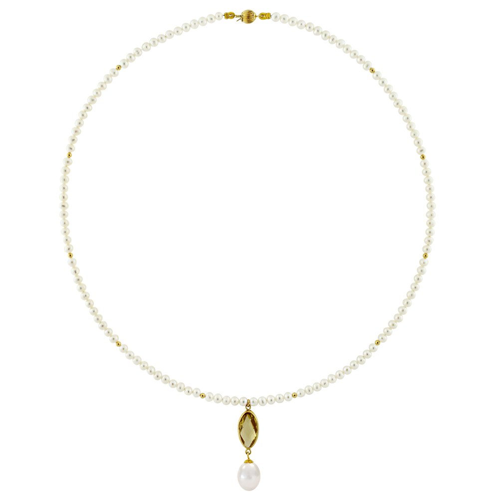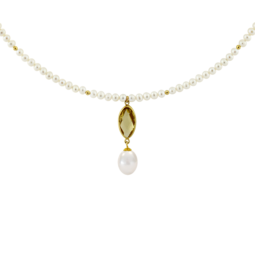 Κολιέ με Κ14 χρυσό κούμπωμα, λευκά μαργαριτάρια και μενταγιόν με citrine - M122703