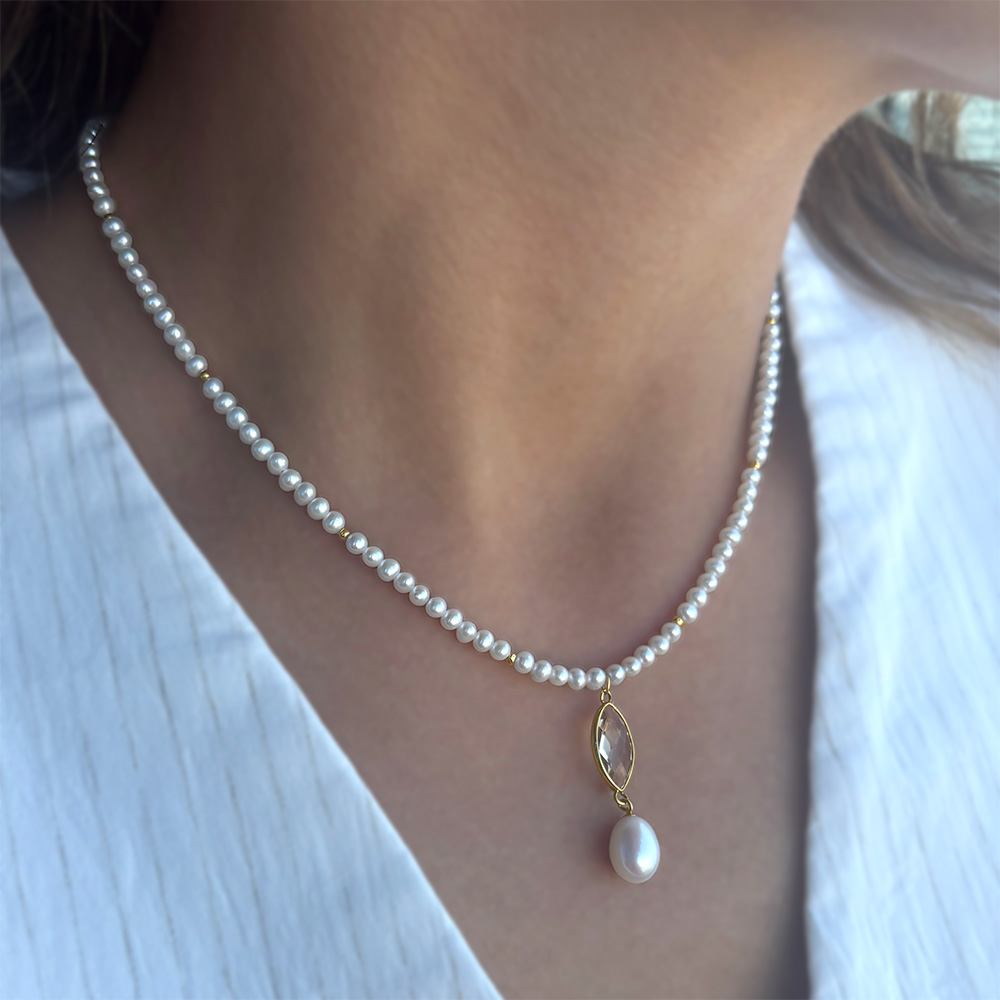 Στο κέντρο του υπάρχει ένα μοναδικό μενταγιόν με 1 λευκό μαργαριτάρι Fresh Water Pearl διαμέτρου 8,5x11 χιλιοστών σε σχήμα Drop (σταγόνα), άριστης ποιότητας, σε χρυσή βάση 14 καρατίων με 1 λαμπερό Citrine (φυσικός ορυκτός λίθος) διαμέτρου 8x13 χιλιοστών.