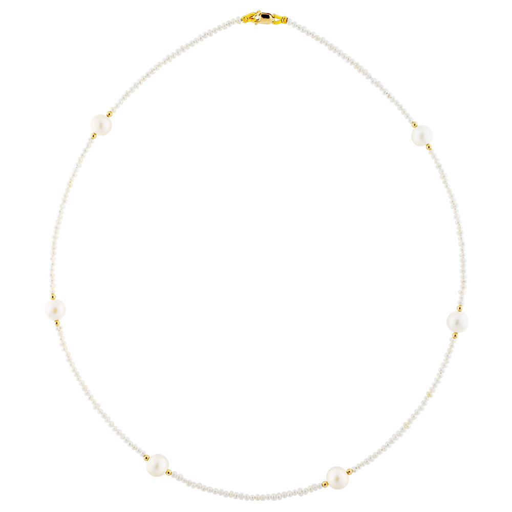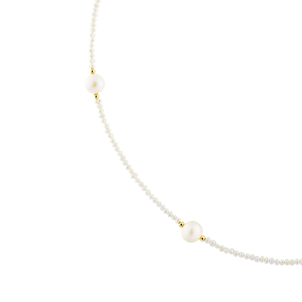 Στο κολιέ υπάρχουν διάσπαρτα λευκά μαργαριτάρια γλυκού νερού Fresh Water Pearl διαμέτρου 6,5 -7 χιλιοστών ανάμεσα σε χρυσά στοιχεία 14 καρατίων το κάθε ένα.