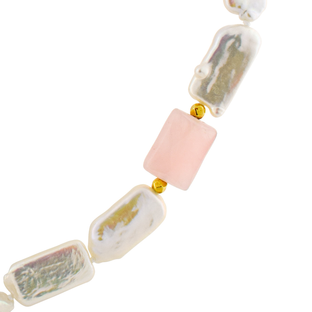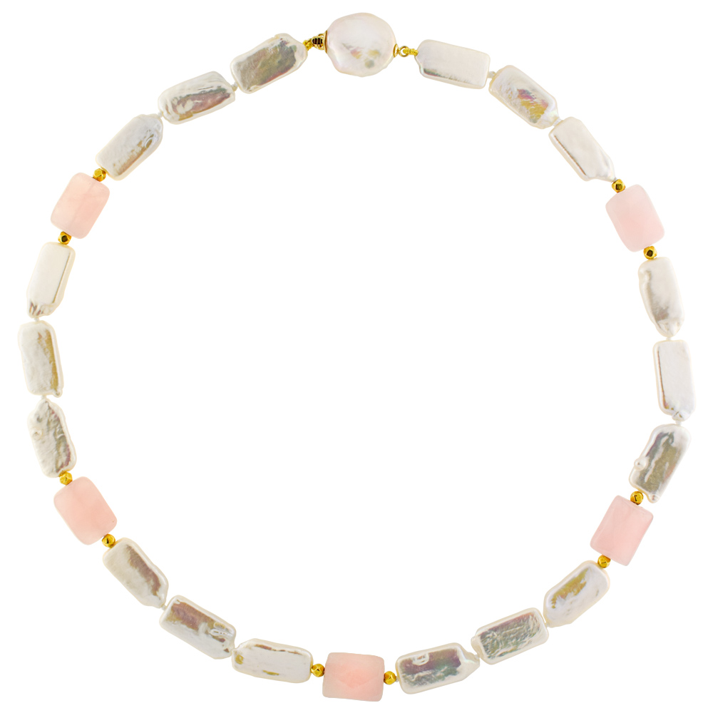 Κολιέ με Κ18 χρυσά στοιχεία, λευκά μαργαριτάρια και pink quartz - M122728