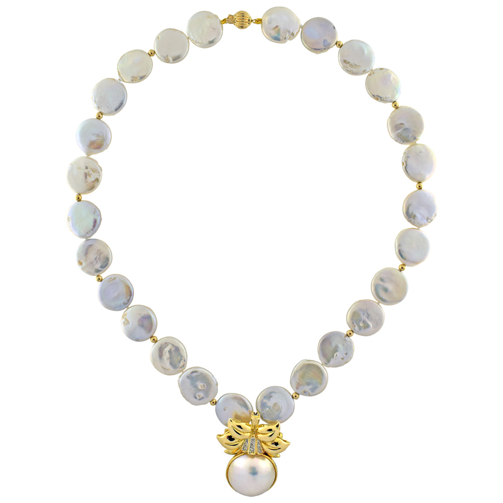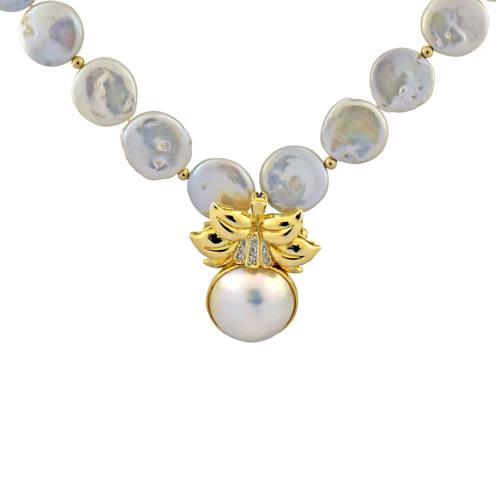 Στο κάτω μέρος του κολιέ υπάρχει ένα μοναδικό μενταγιόν με λευκό μαργαριτάρι Fresh Water Pearl διαμέτρου 19,0 χιλιοστά σε χρυσή βάση 14 καρατίων με 7 διαμάντια 0,09ct.
