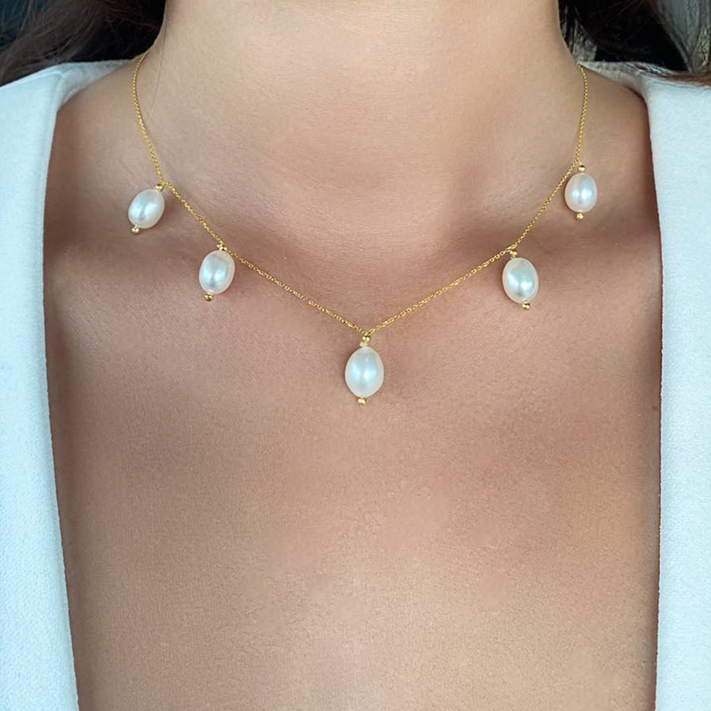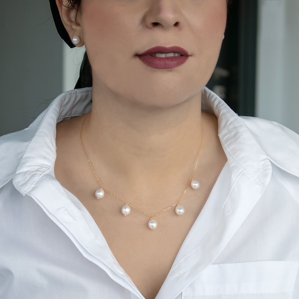 • Ένα υπέροχο κολιέ με 5 λευκά μαργαριτάρια Fresh Water Pearl διαμέτρου 9 - 12 χιλιοστά σε σχήμα Drop (σταγόνα)άριστης ποιότητας.