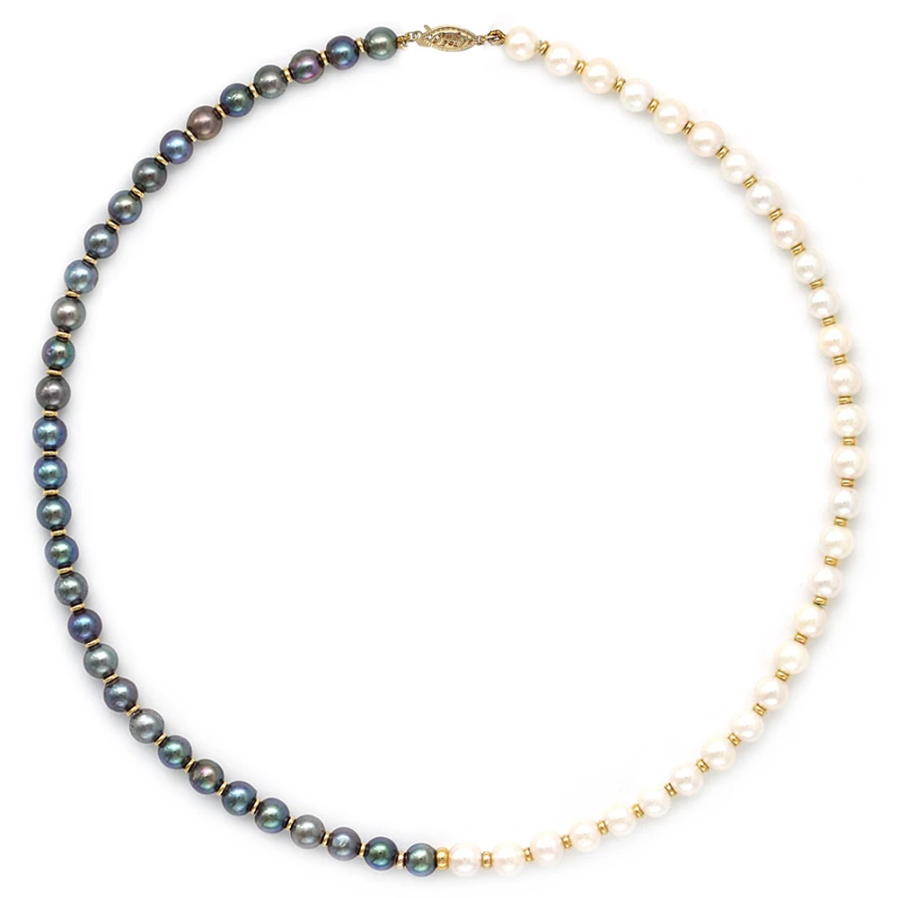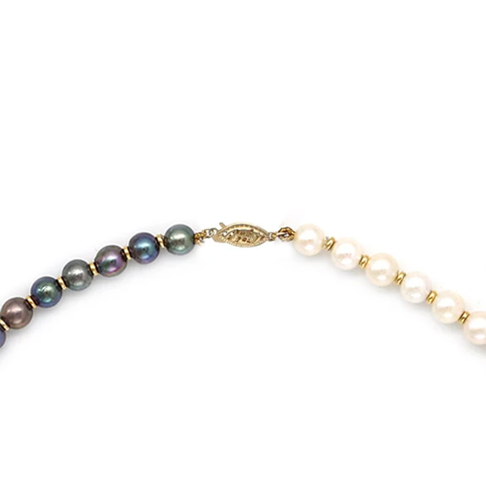 • Ένα μοναδικό κολιέ με λευκά και μαύρα μαργαριτάρια θαλάσσης QTV Akoya Pearl διαμέτρου 6,5 χιλιοστών σε σχήμα Round (στρόγγυλο).