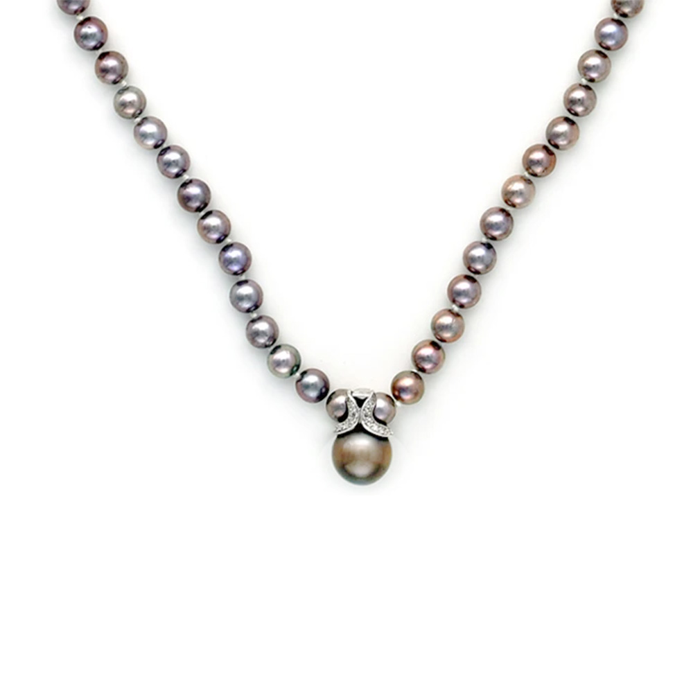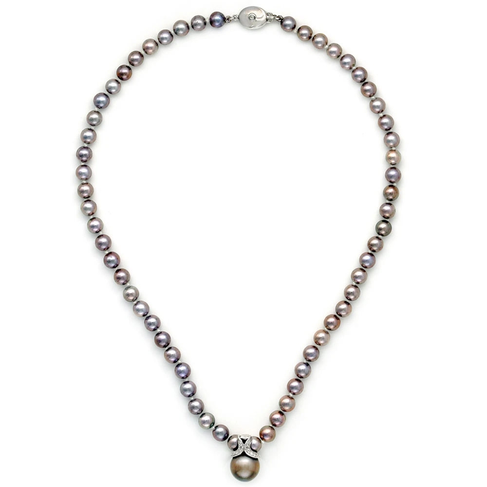 Στο κάτω μέρος του κολιέ υπάρχει ένα μοναδικό μενταγιόν με ένα υπέροχο και ολοστρόγγυλο φυσικό μαύρο μαργαριτάρι θαλάσσης South Sea Tahiti διαμέτρου 12,3 χιλιοστών σε λευκόχρυση βάση 18 καρατίων με 16 διαμάντια 0,12ct.