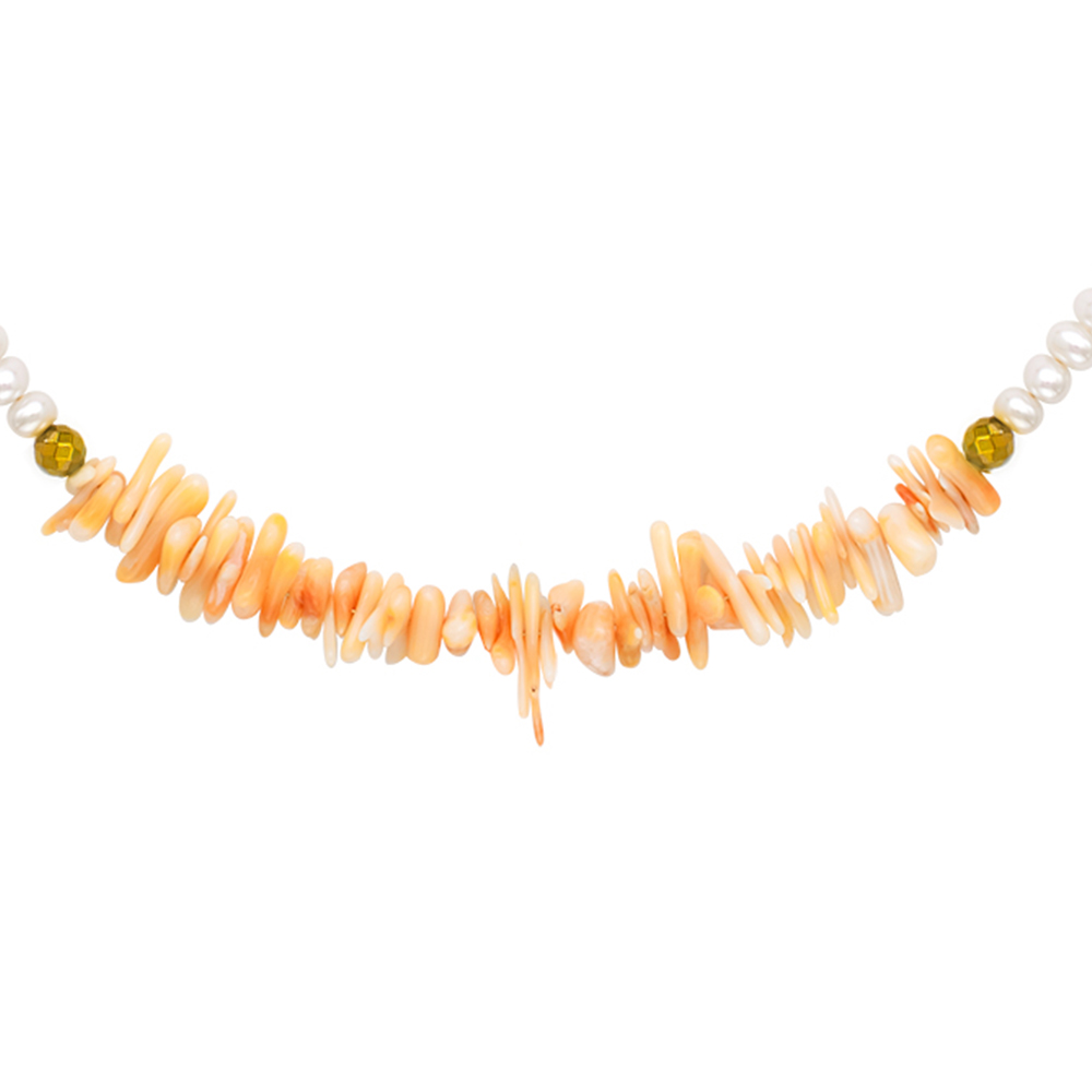 Ανάμεσα στα κοράλλια και στα λευκά μαργαριτάρια υπάρχουν 2 hematite χρυσού χρωματισμού πολυεδρικής κοπής, προσθέτοντας στο κολιέ περισσότερη λάμψη.