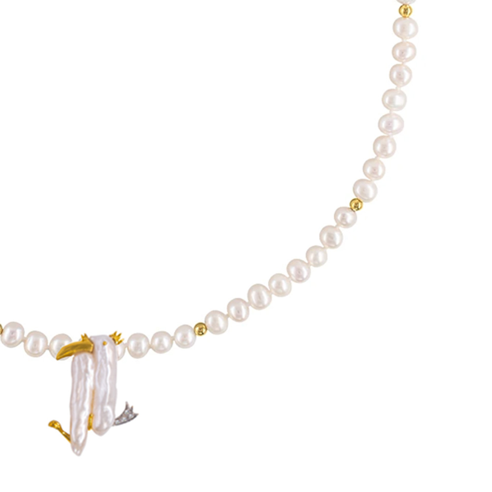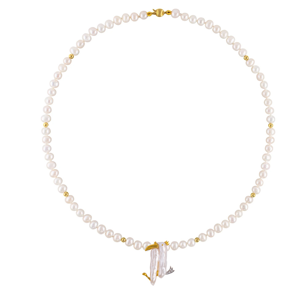 Στο κέντρο του κολιέ υπάρχει ένα χρυσό 18 καρατίων εντυπωσιακό μενταγιόν με λευκό μαργαριτάρι Biwa διάστασης 3,5 εκατοστών, το οποίο σχηματίζει με το μαργαριτάρι και τα χρυσά στοιχεία τη μορφή ενός πιγκουίνου με εξαιρετική τεχνοτροπία.