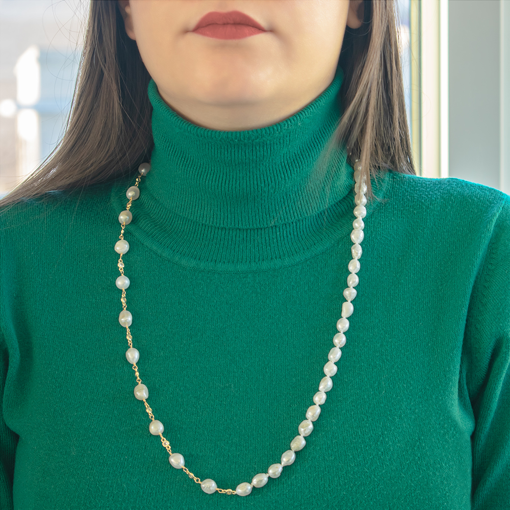 • Ένα υπέροχο κολιέ με λευκά μαργαριτάρια Fresh Water Pearl διαμέτρου 8 x 10 χιλιοστών σε σχήμα Long.