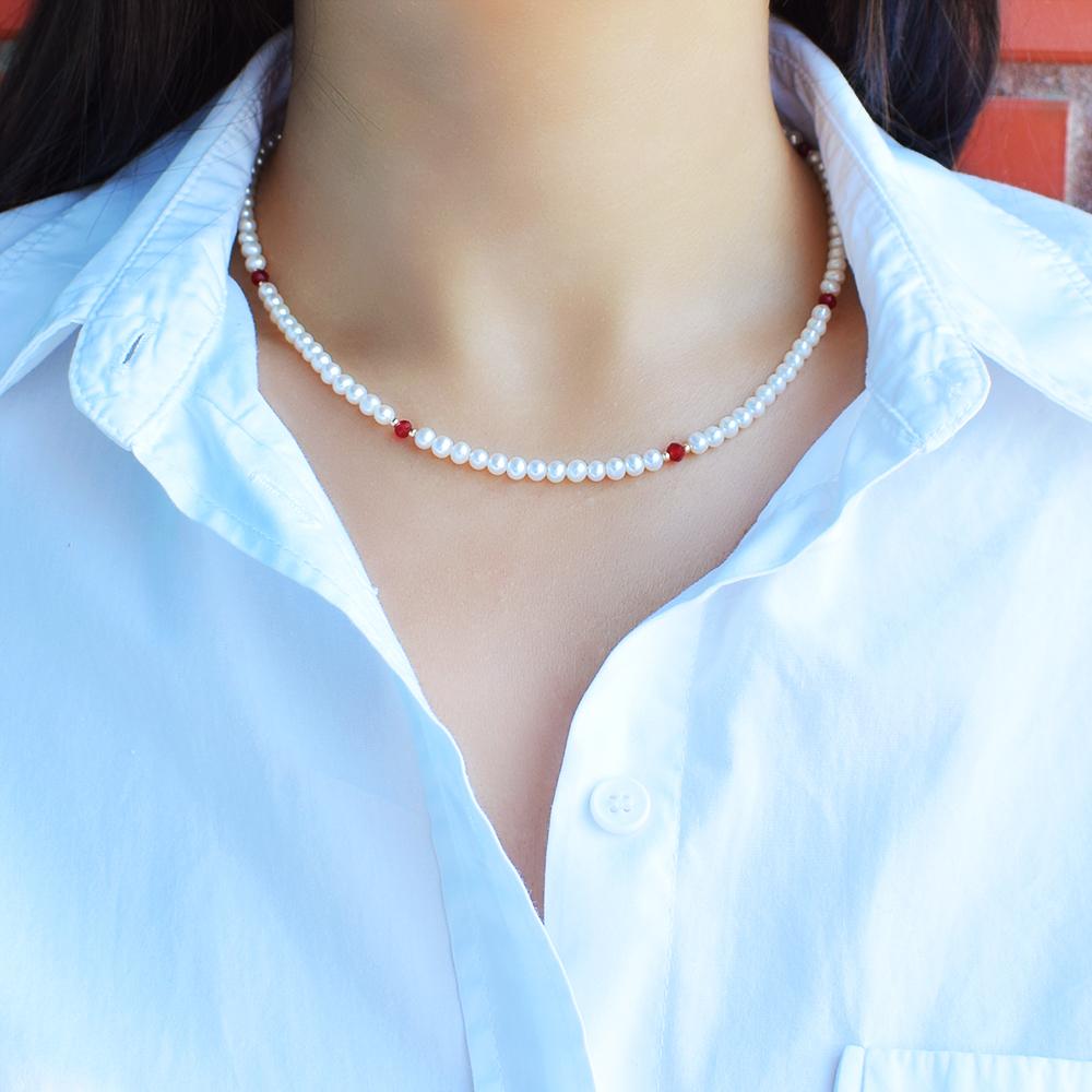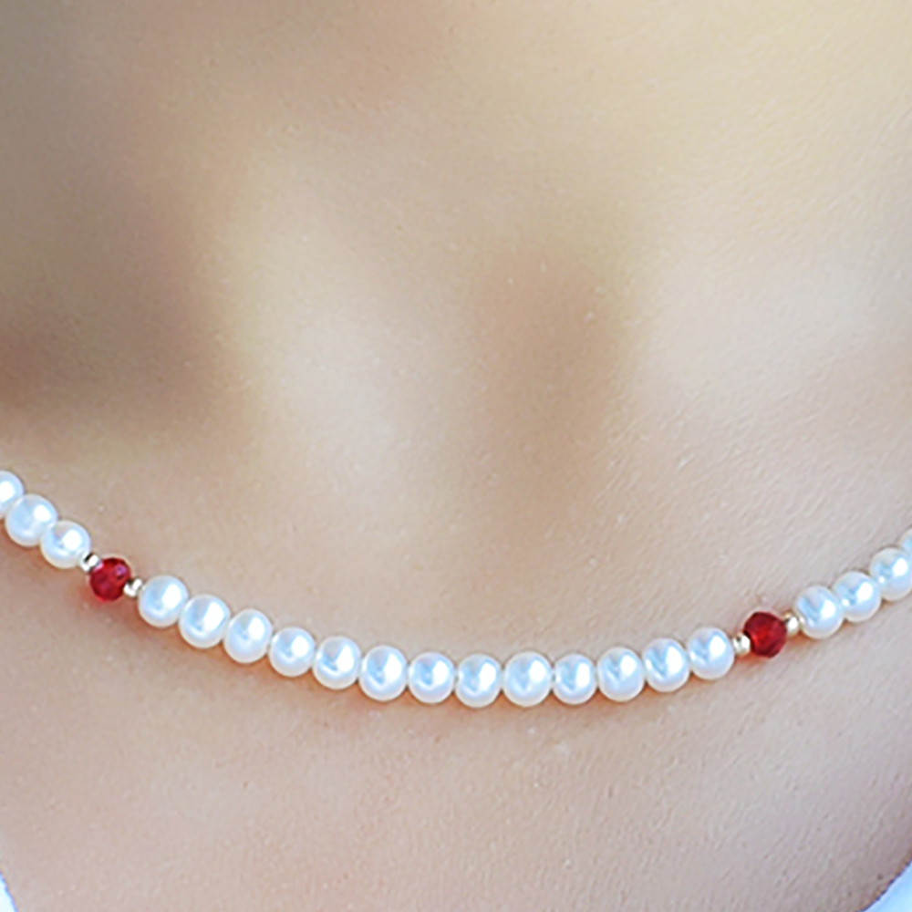 • Ένα υπέροχο κολιέ από λευκά μαργαριτάρια γλυκού νερού Fresh Water Pearl διαμέτρου 4,5 - 5 χιλιοστών.