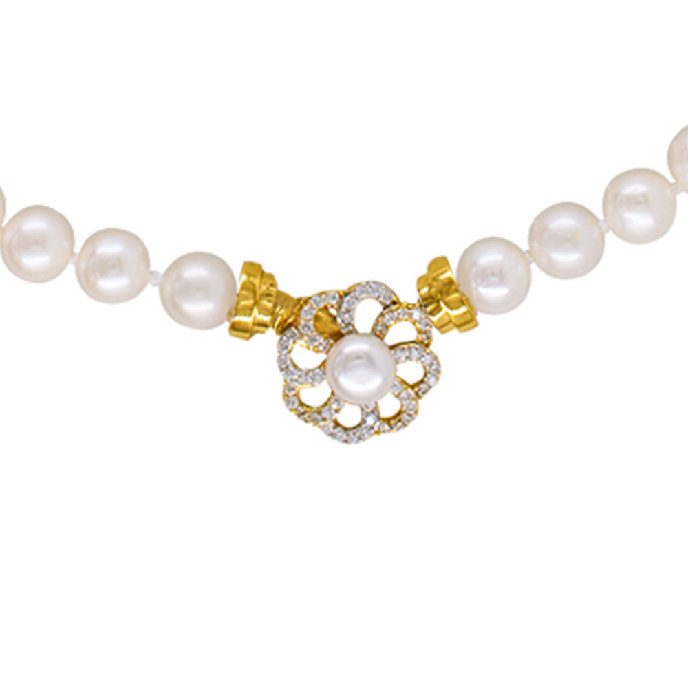 Στο κέντρο του κολιέ υπάρχει ένα ιδιαίτερο μοναδικό χειροποίητο χρυσό κούμπωμα - μοτίφ ασφαλείας 14 καρατίων διάστασης 2 εκατοστών σε σχήμα λουλούδι διακοσμημένο όλο με λαμπερά ζιργκόν και στο κέντρο του υπάρχει ένα λευκό μαργαριτάρι Fresh Water Pearl διαμέτρου 7 χιλιοστών.