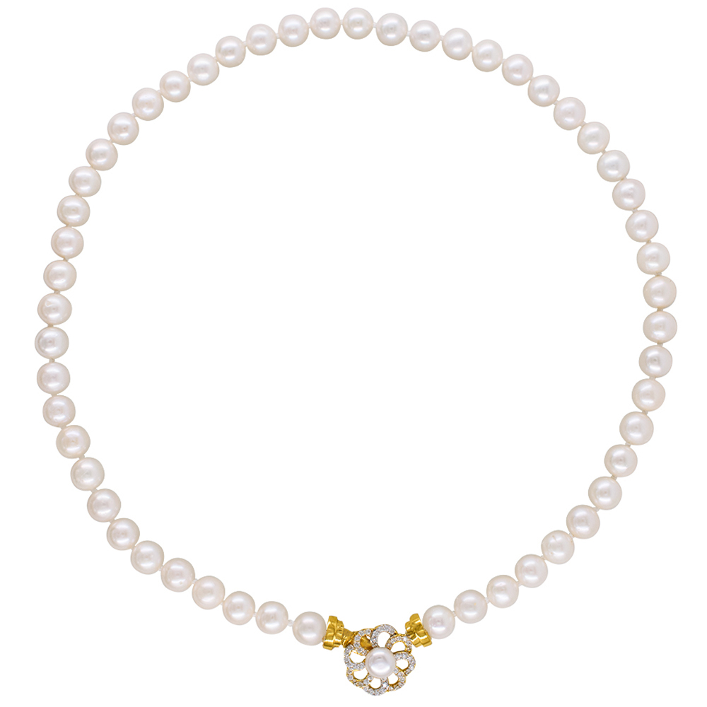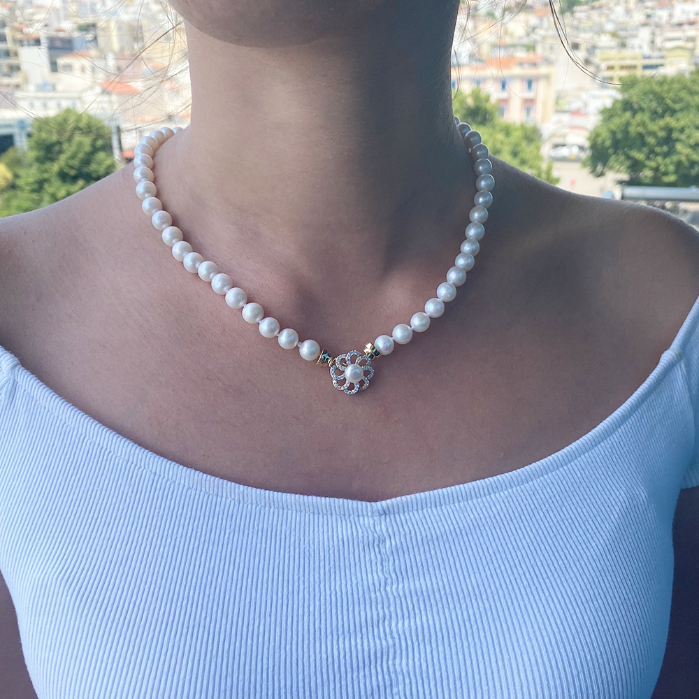 • Ένα υντυπωσιακό και μοναδικό κολιέ με λευκά στρόγγυλα μαργαριτάρια Fresh Water Pearl διαμέτρου 8 χιλιοστών.