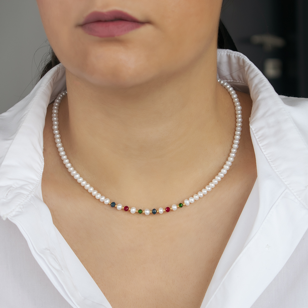 Κολιέ με Κ14 χρυσά στοιχεία, λευκά μαργαριτάρια και πολύχρωμα ζιργκόν - S123983M