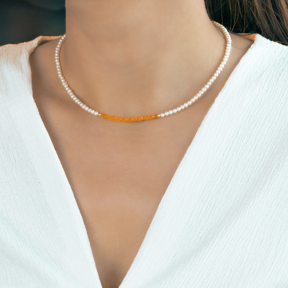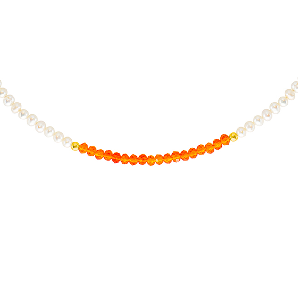 Στο κέντρο του κολιέ υπάρχουν 18 salomite σε χρώμα πορτοκαλί και 2 χρυσές ροδέλες 14 καρατίων.