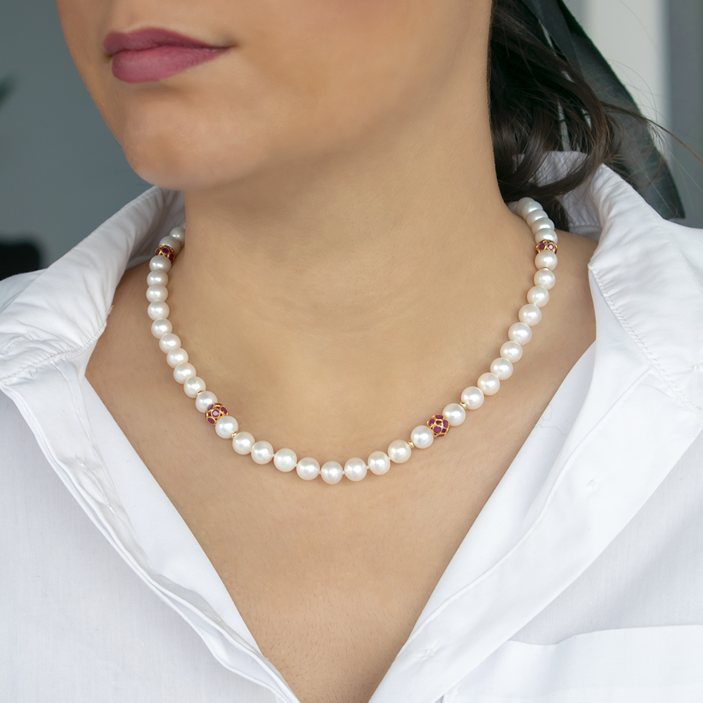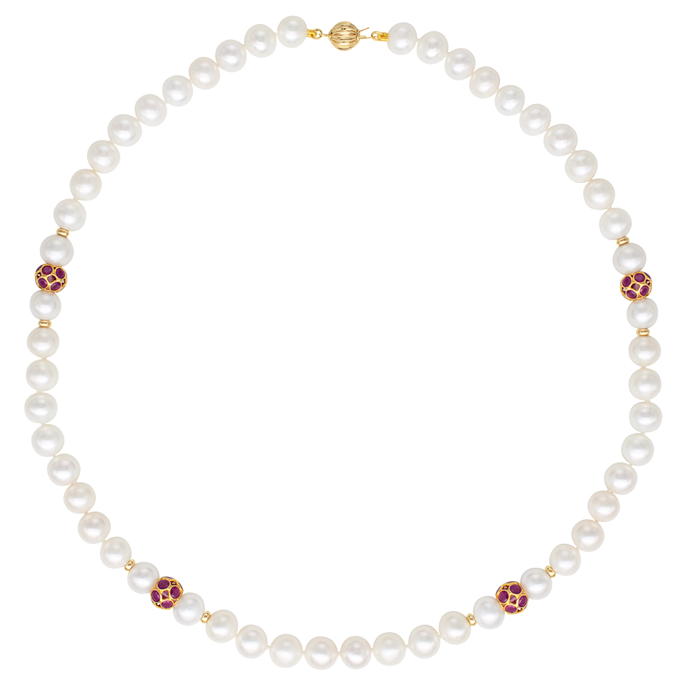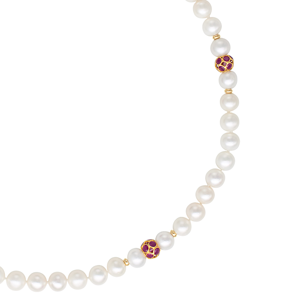 Κολιέ με Κ14 χρυσό κούμπωμα, λευκά μαργαριτάρια και ρουμπίνια - F124648