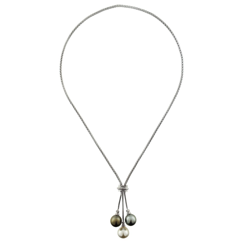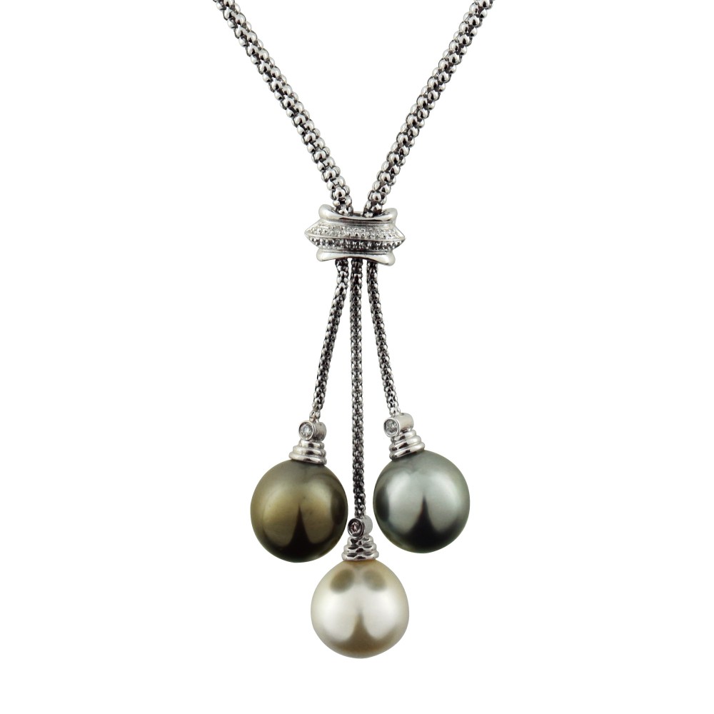 • Ένα μοναδικό κολιέ με σπάνια και εντυπωσιακά φυσικά μαργαριτάρια, 1 λευκό South Sea Australia, 1 μαύρο South Sea Tahitiκαι γκρι South Sea Tahiti διαμέτρου 13,0 χιλιοστά, άριστης ποιότητας και σχήματος Round (στρόγγυλο), σε λευκόχρυση 18 καρατίων Sock Chain.