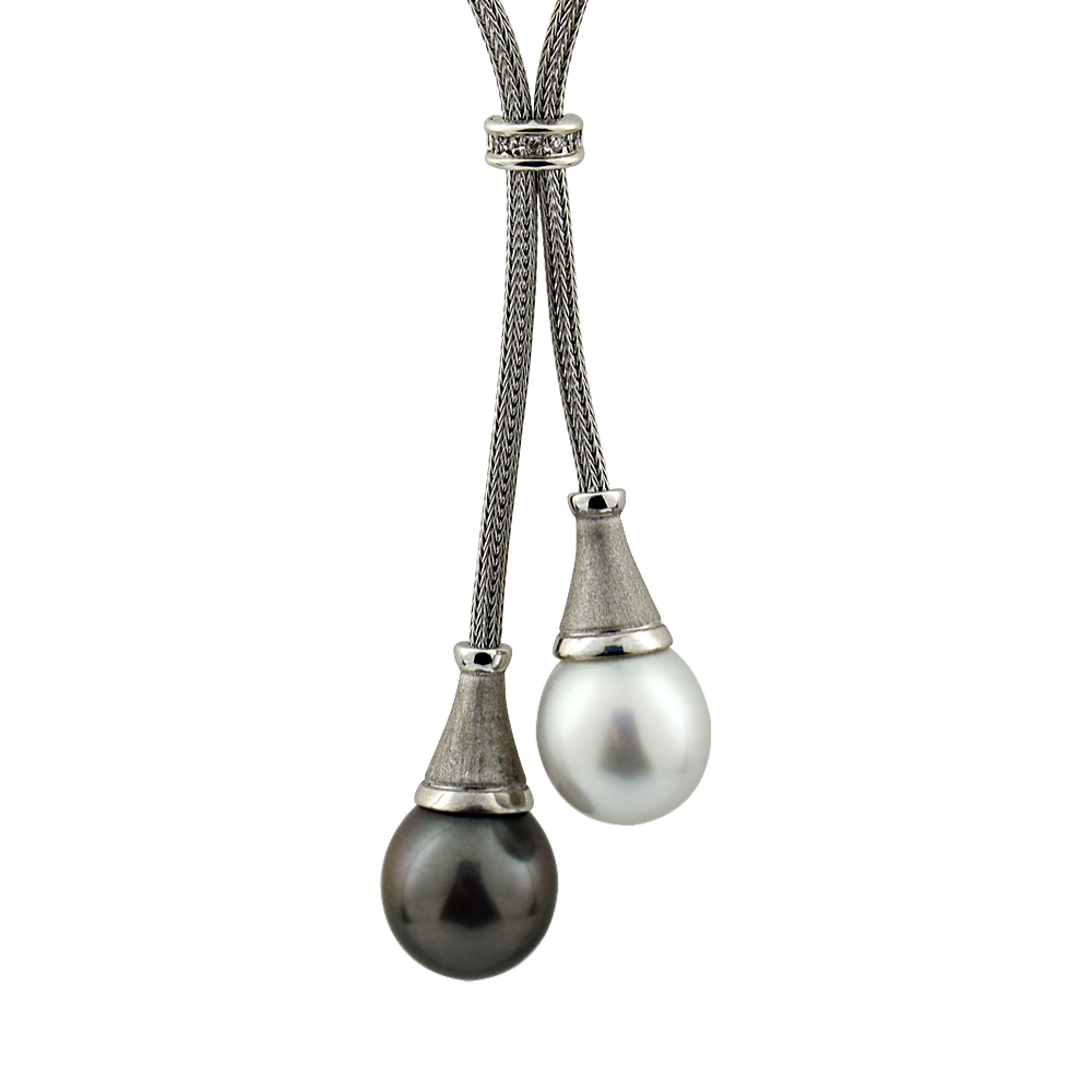 • Ένα μοναδικό κολιέ με 2 σπάνια και εντυπωσιακά φυσικά μαργαριτάρια, 1 λευκό South Sea Australia  και 1 μαύρο South Sea Tahiti διαμέτρου από 13,0 έως 14,0 χιλιοστά, άριστης ποιότητας και σχήματος Round (στρόγγυλο), σε λευκόχρυση 18 καρατίων Sock Chain.με λευκόχρυσο κούμπωμα ασφαλείας 18 καρατίων.