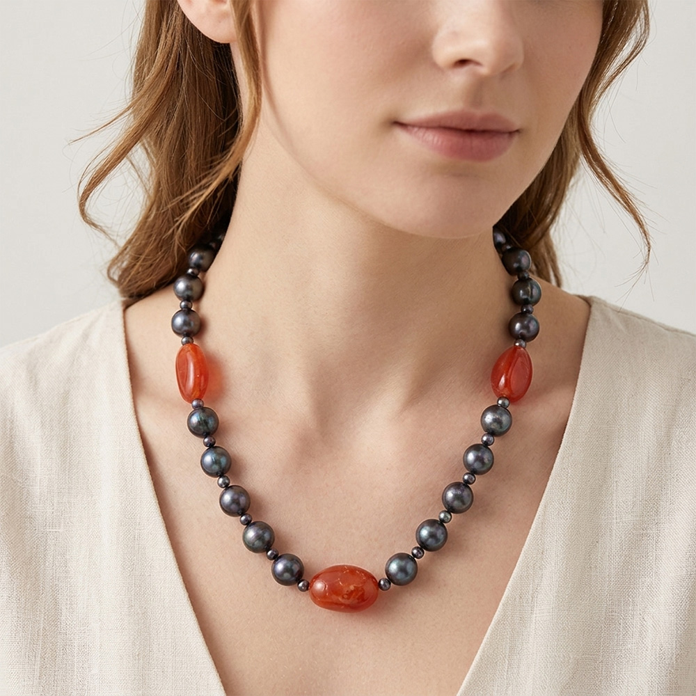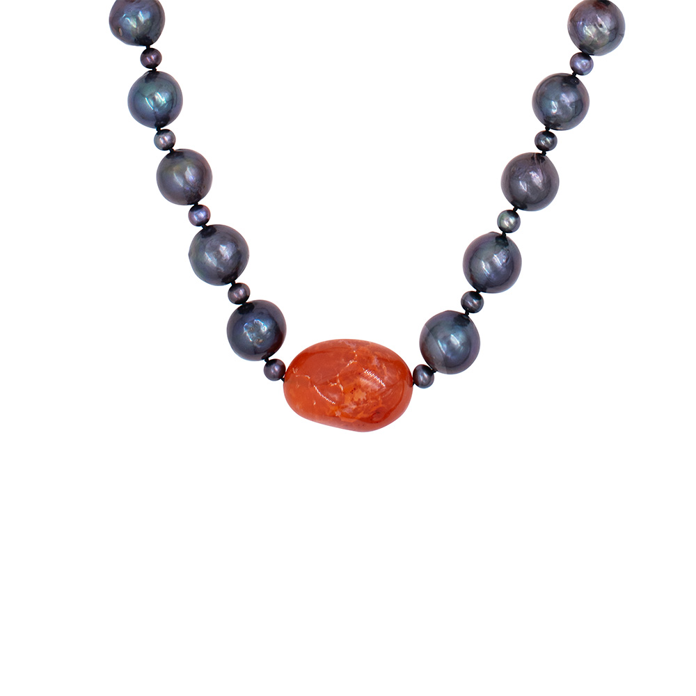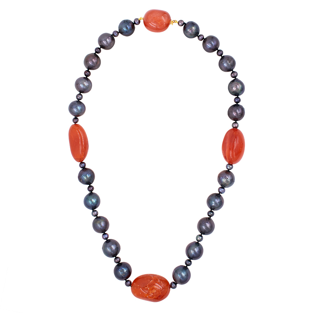 Ένα εντυπωσιακό κολιέ με μοντέρνα αισθητική για όσους τολμούν να συνδυάσουν την ομορφιά των μαύρων μαργαριταριών με το ζεστό χρώμα της καρνεόλης.