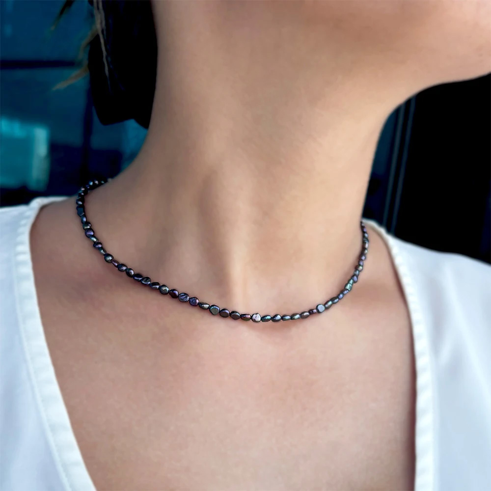 • Ένα υπέροχο κολιέ με μαύρα μαργαριτάρια Fresh Water Pearls διαμέτρου 3,5 χιλιοστών με ιδιαίτερους φυσικούς ιριδισμούς.