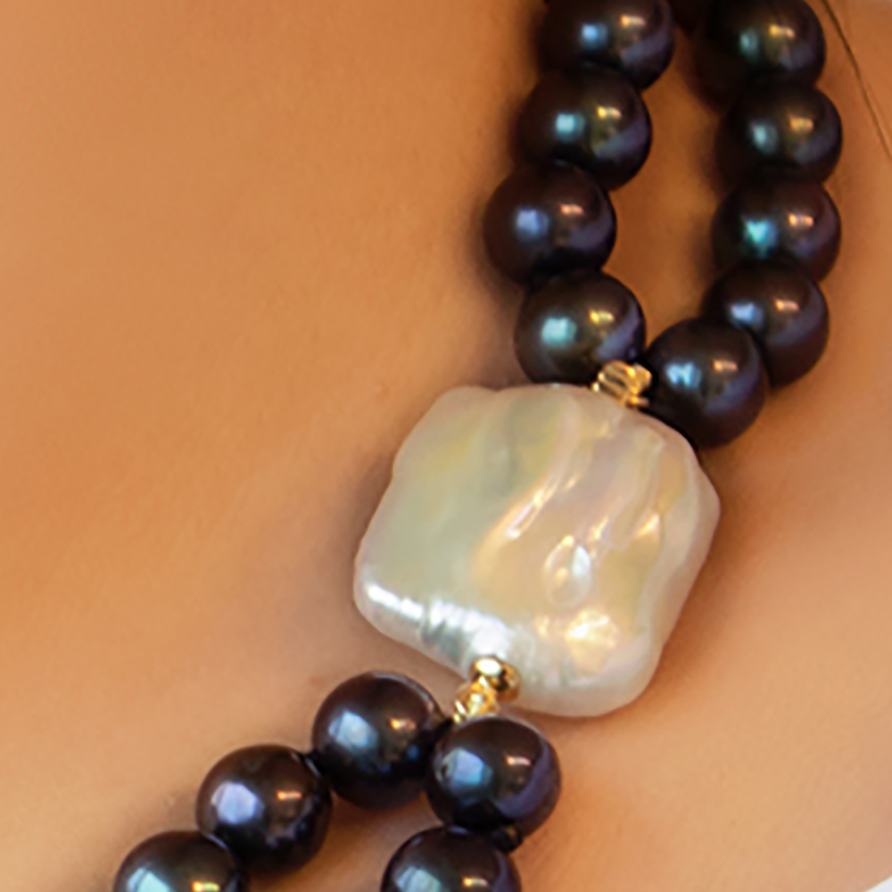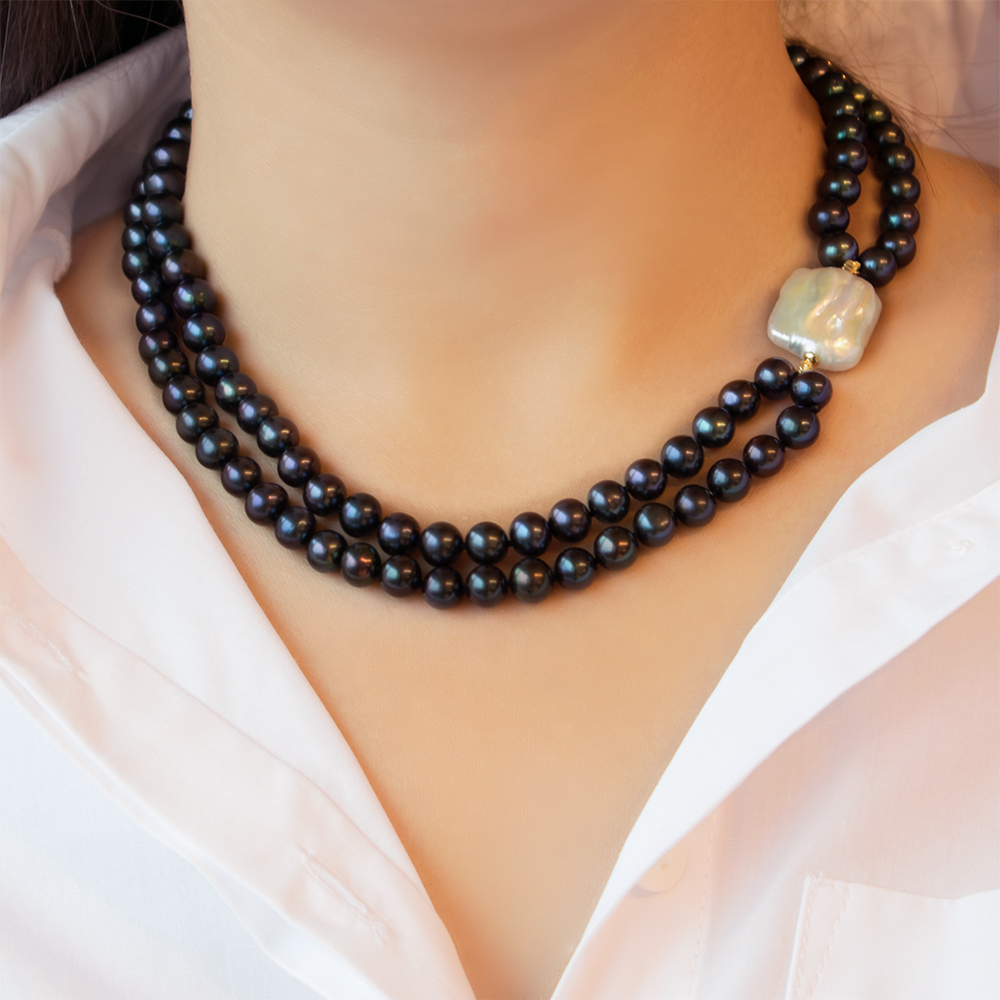 • Ένα καταπληκτικό κολιέ από 2 σειρές διαφορετικού μήκους, μαύρα μαργαριτάρια γλυκού νερού Fresh Water Pearl διαμέτρου 7,5-8 χιλιοστών, άριστης ποιότητας σε σχήμα Round (στρόγγυλο).