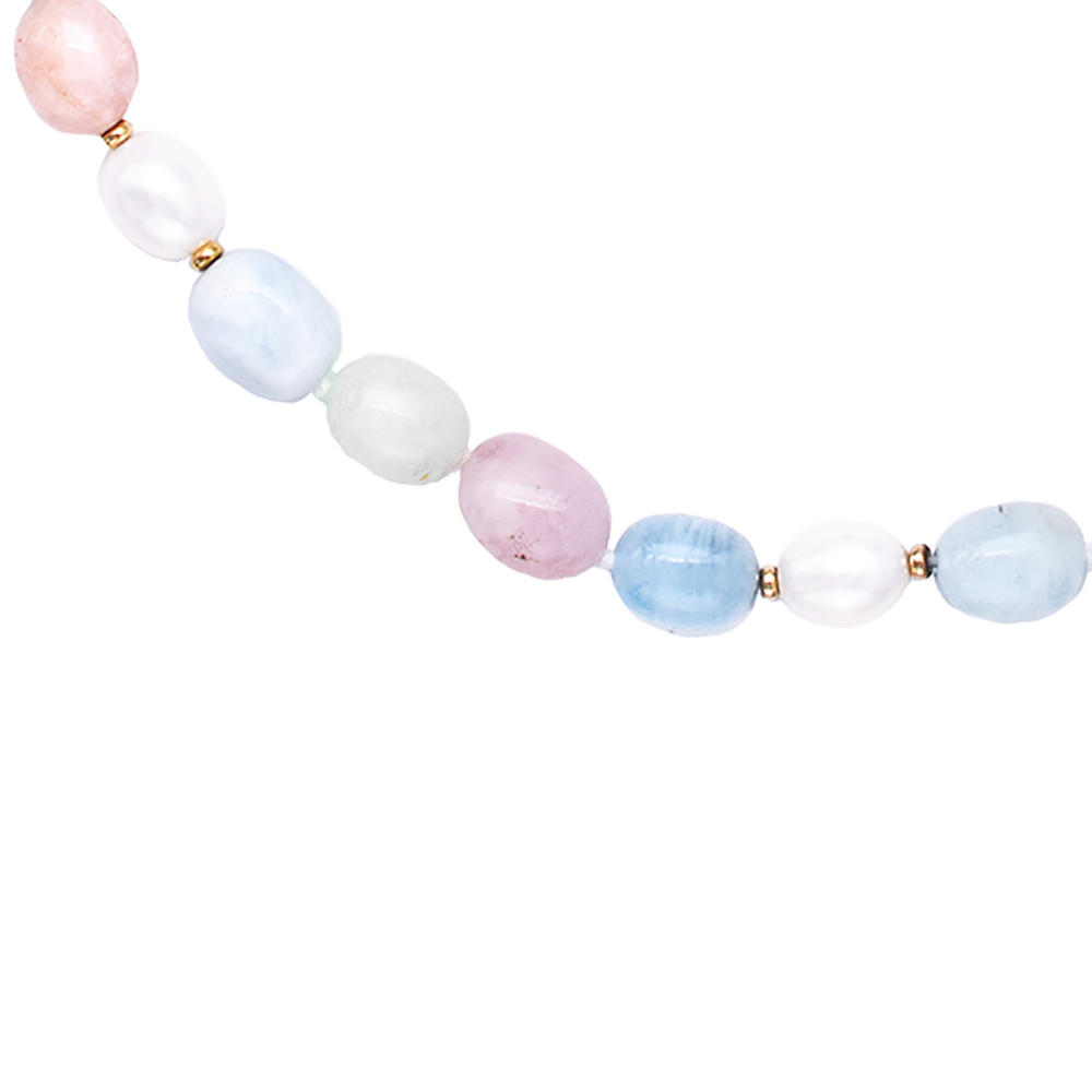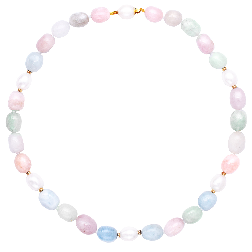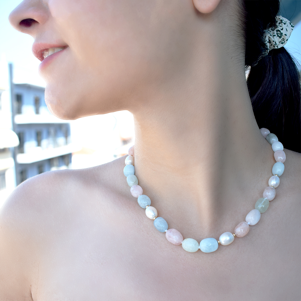Κολιέ με μοργκανίτη, χρυσά στοιχεία Κ18 και μαργαριτάρια- M123585
